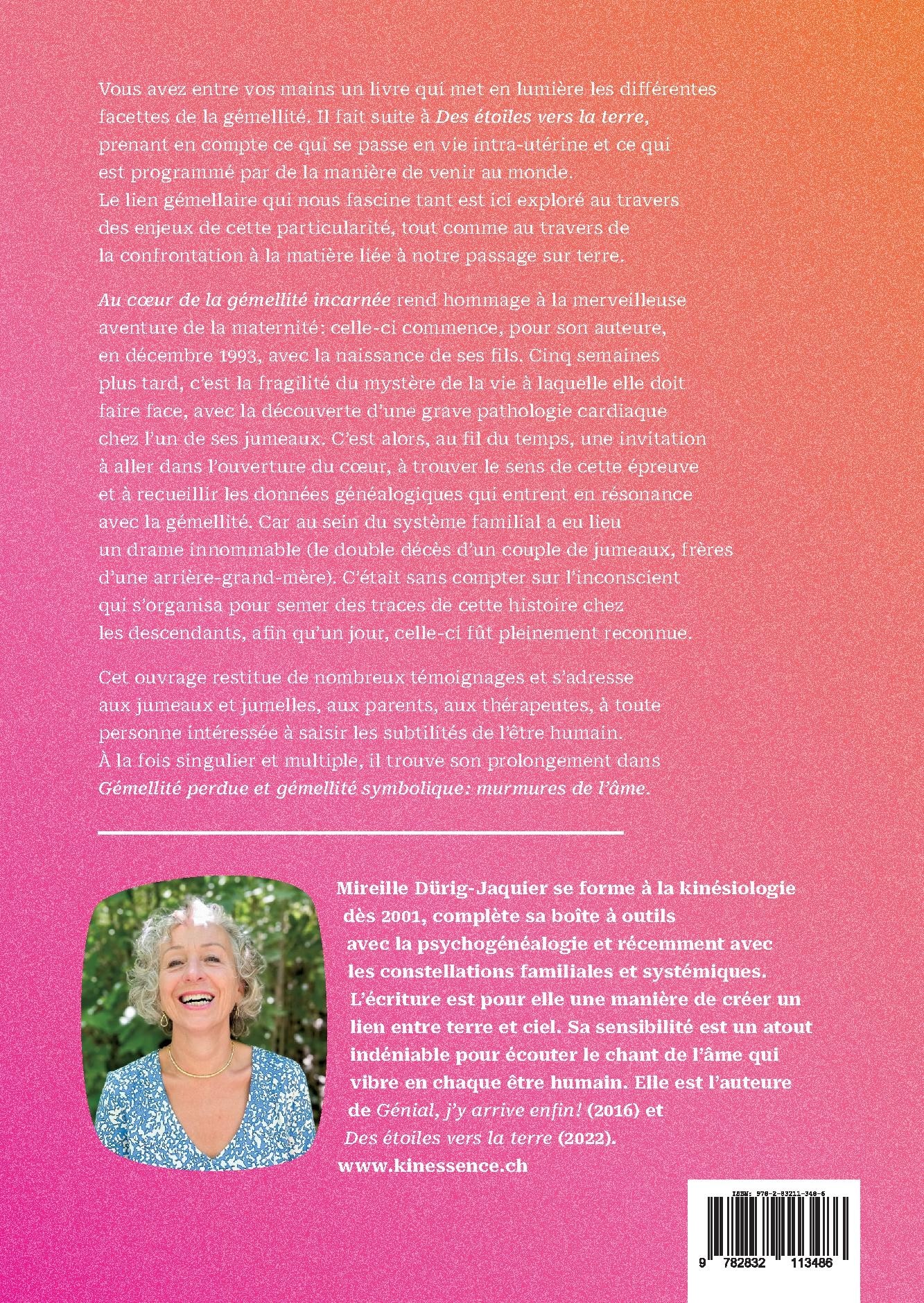 Vous avez entre vos mains un livre qui met en lumière les différentes facettes de la gémellité. Il fait suite à Des étoiles vers la terre, prenant en compte ce qui se passe en vie intra utérine et ce qui est programmé au travers de la manière de venir au monde. Le lien gémellaire qui nous fascine tant est ici exploré au travers des enjeux de cette particularité, tout comme au travers de la confrontation à la matière liée à notre passage sur terre.