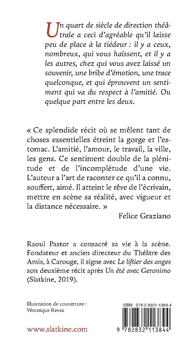 Raoul Pastor a consacré sa vie à la scène. Fondateur et ancien directeur du Théâtre des Amis, à Carouge, il signe avec Le liftier des anges son deuxième récit après Un été avec Geronimo (Slatkine, 2019).