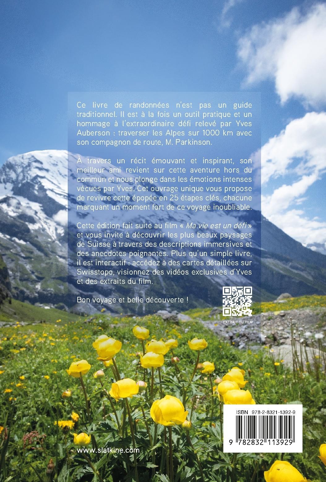 Cette édition fait suite au film « Ma vie est un défi » et vous invite à découvrir les plus beaux paysages de Suisse à travers des descriptions immersives et des anecdotes poignantes. Plus qu’un simple livre, il est interactif : accédez à des cartes détaillées sur Swisstopo, visionnez des vidéos exclusives d’Yves et des extraits du film.