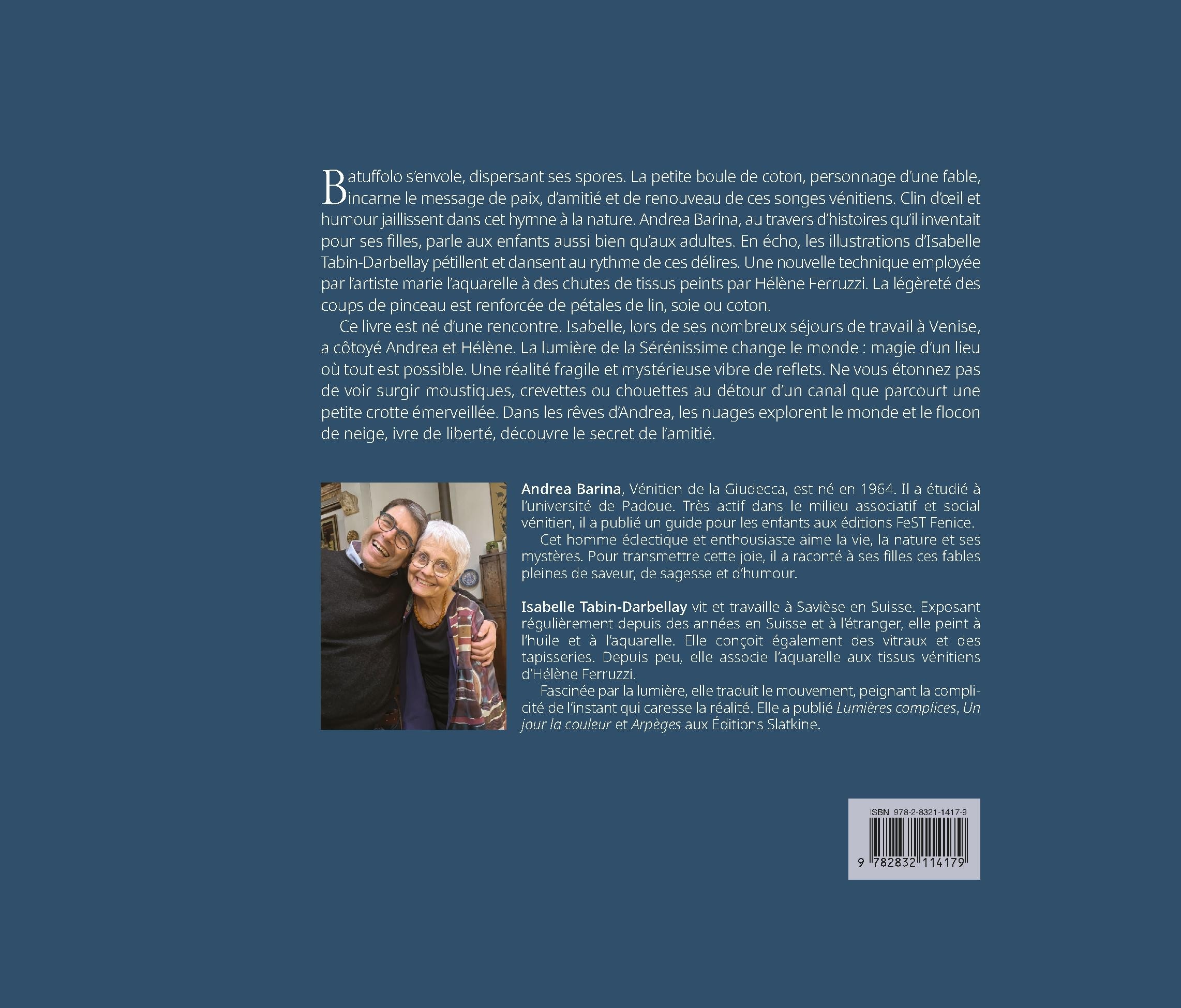 Batuffolo s’envole, dispersant ses spores. La petite boule de coton, personnage d’une fable, incarne le message de paix, d’amitié et de renouveau de ces songes vénitiens. Clin d’œil et humour jaillissent dans cet hymne à la nature. Andrea Barina, au travers d’histoires qu’il inventait pour ses filles, parle aux enfants aussi bien qu’aux adultes. En écho, les illustrations d’Isabelle Tabin-Darbellay pétillent et dansent au rythme de ces délires. Une nouvelle technique employée par l’artiste marie l’aquarelle à des chutes de tissus peints par Hélène Ferruzzi. La légèreté des coups de pinceau est renforcée de pétales de lin, soie ou coton.