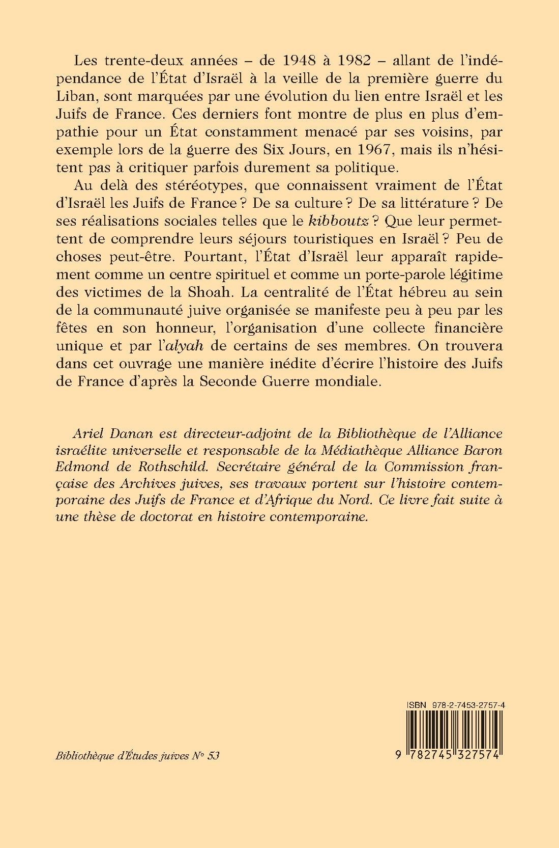 d’Israël les Juifs de France ? De sa culture? De sa littérature ? De ses réalisations sociales telles que le kibboutz ? Que leur permettent de comprendre leurs séjours touristiques en Israël ? Peu de choses peut-être. Pourtant, l’État d’Israël leur apparaît rapidement comme un centre spirituel et comme un porte-parole légitime des victimes de la Shoah. La centralité de l’État hébreu au sein de la communauté juive organisée se manifeste peu à peu par les fêtes en son honneur, l’organisation d’une collecte financière unique et par l’alyah de certains de ses membres. On trouvera dans cet ouvrage une manière inédite d’écrire l’histoire des Juifs de France d’après la Seconde Guerre mondiale.
