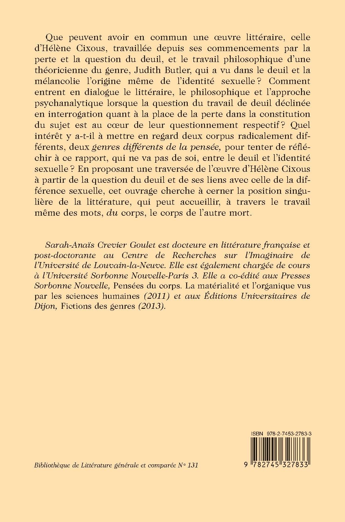 Que peuvent avoir en commun une oeuvre littéraire, celle d’Hélène Cixous, travaillée depuis ses commencements par la perte et la question du deuil, et le travail philosophique d’une théoricienne du genre, Judith Butler, qui a vu dans le deuil et la mélancolie l’origine même de l’identité sexuelle? Comment entrent en dialogue le littéraire, le philosophique et l’approche psychanalytique lorsque la question du travail de deuil déclinée en interrogation quant à la place de la perte dans la constitution du sujet est au coeur de leur questionnement respectif ? Quel intérêt y a-t-il à mettre en regard deux corpus radicalement différents, deux genres différents de la pensée, pour tenter de réfléchir à ce rapport, qui ne va pas de soi, entre le deuil et l’identité sexuelle ? En proposant une traversée de l’oeuvre d’Hélène Cixous à partir de la question du deuil et de ses liens avec celle de la différence sexuelle, cet ouvrage cherche à cerner la position singulière de la littérature, qui peut accueillir, à travers le travail même des mots, du corps, le corps de l’autre mort.