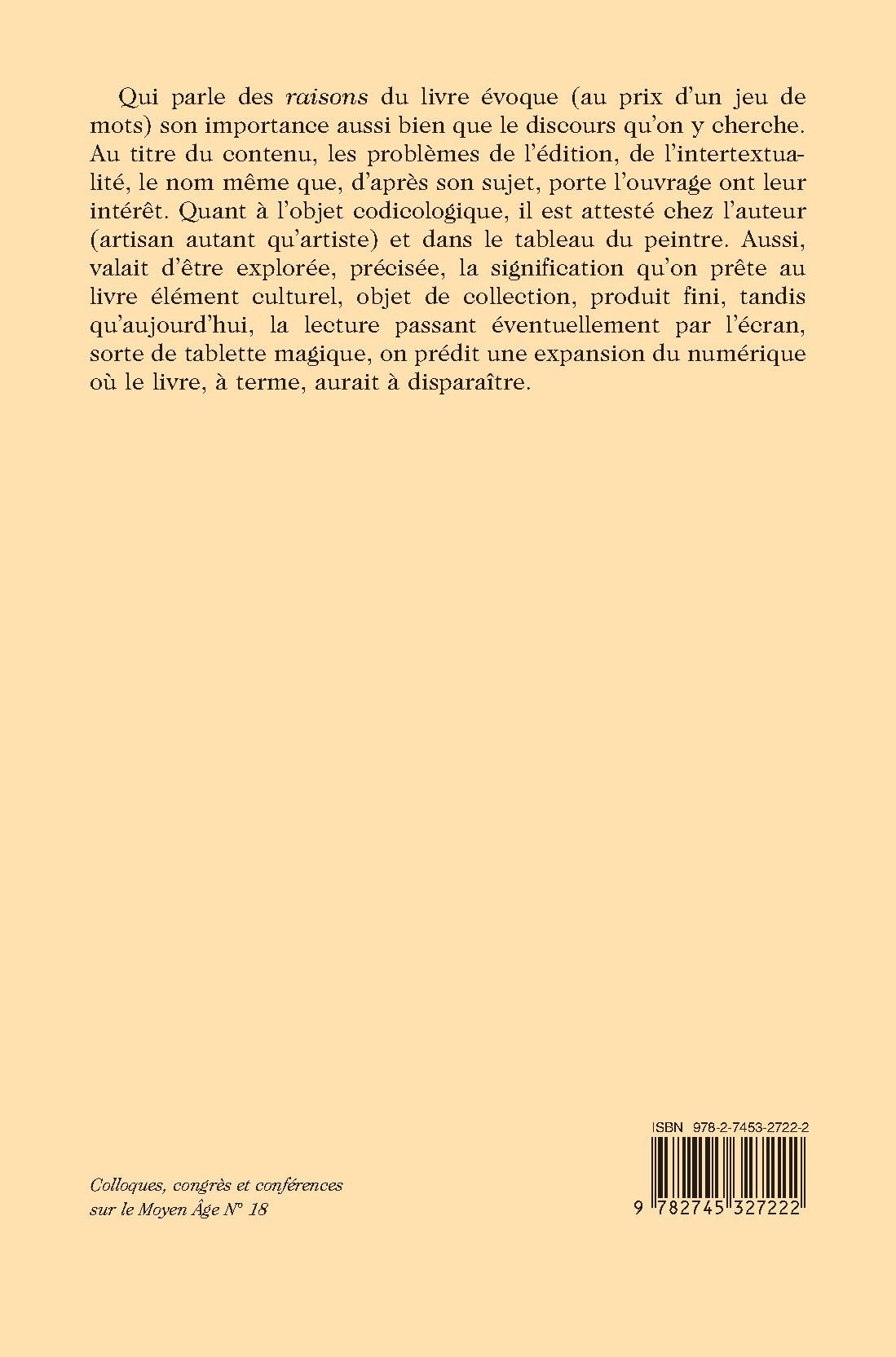Qui parle des raisons du livre évoque (au prix d’un jeu de mots) son importance aussi bien que le discours qu’on y cherche. Au titre du contenu, les problèmes de l’édition, de l’intertextualité, le nom même que, d’après son sujet, porte l’ouvrage ont leur intérêt. Quant à l’objet codicologique, il est attesté chez l’auteur (artisan autant qu’artiste) et dans le tableau du peintre. Aussi, valait d’être explorée, précisée, la signification qu’on prête au livre élément culturel, objet de collection, produit fini, tandis qu’aujourd’hui, la lecture passant éventuellement par l’écran, sorte de tablette magique, on prédit une expansion du numérique où le livre, à terme, aurait à disparaître.