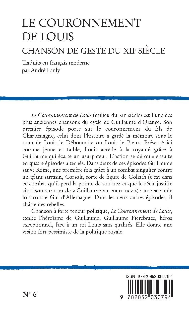 « Le Couronnement de Louis » (milieu du XIIe siècle) est l’une des plus anciennes chansons du cycle de Guillaume d’Orange. Son premier épisode porte sur le couronnement du fils de Charlemagne, celui dont l’histoire a gardé la mémoire sous le nom de Louis le Débonnaire ou Louis le Pieux. Présenté ici comme jeune et faible, Louis accède à la royauté grâce à Guillaume qui écarte un usurpateur. L’action se déroule ensuite en quatre épisodes alternés. Dans deux de ces épisodes Guillaume sauve Rome, une première fois grâce à un combat singulier contre un géant sarrasin, Corsolt, sorte de figure de Goliath (c’est dans ce combat qu’il perd la pointe de son nez et que le récit justifie ainsi son surnom de « Guillaume au court nez ») ; une seconde fois contre Gui d’Allemagne. Dans les deux autres épisodes, il châtie des rebelles. Chanson à forte teneur politique, « Le Couronnement de Louis », exalte l’héroïsme de Guillaume, Guillaume Fierebrace, héros exceptionnel, face à un roi Louis sans qualités. Elle donne une vision fort pessimiste de la politique royale.