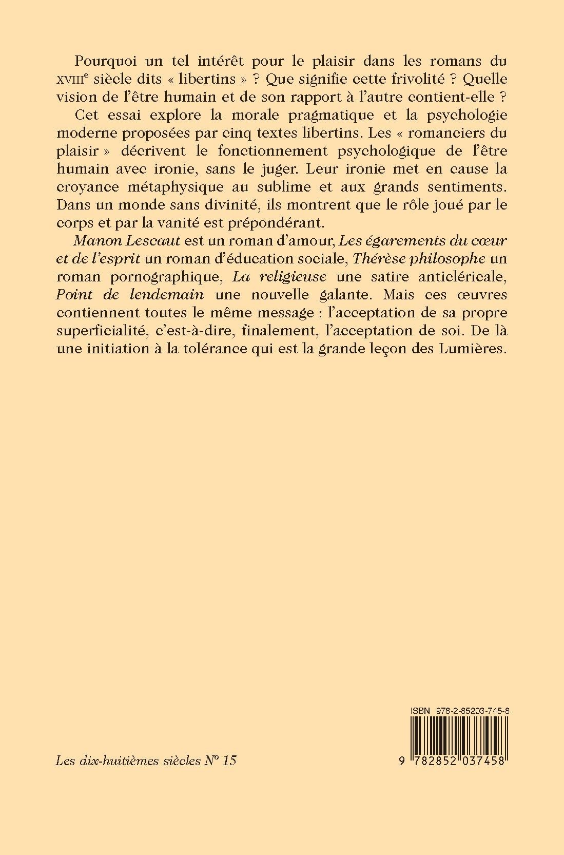 Cet essai explore la morale pragmatique et la psychologie moderne proposée par cinq textes libertins. Les "romanciers du plaisir" décrivent le fonctionnement psychologique de l'être humain avec ironie, sans le juger. Leur ironie met en cause la croyance métaphysique au sublime et aux grands sentiments. Dans un monde sans divinité, ils montrent que le rôle joué par le corps et par la vanité est prépondérant.