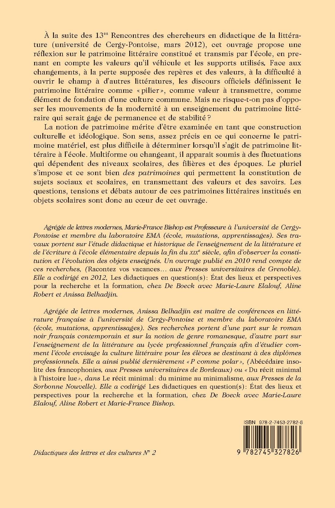 La notion de patrimoine mérite d’être examinée en tant que construction culturelle et idéologique. Son sens, assez précis en ce qui concerne le patrimoine matériel, est plus difficile à déterminer lorsqu’il s’agit de patrimoine littéraire à l’école. Multiforme ou changeant, il apparait soumis à des fluctuations qui dépendent des niveaux scolaires, des filières et des époques. Le pluriel s’impose et ce sont bien des patrimoines qui permettent la constitution de sujets sociaux et scolaires, en transmettant des valeurs et des savoirs. Les questions, tensions et débats autour de ces patrimoines littéraires institués en objets scolaires sont donc au coeur de cet ouvrage.