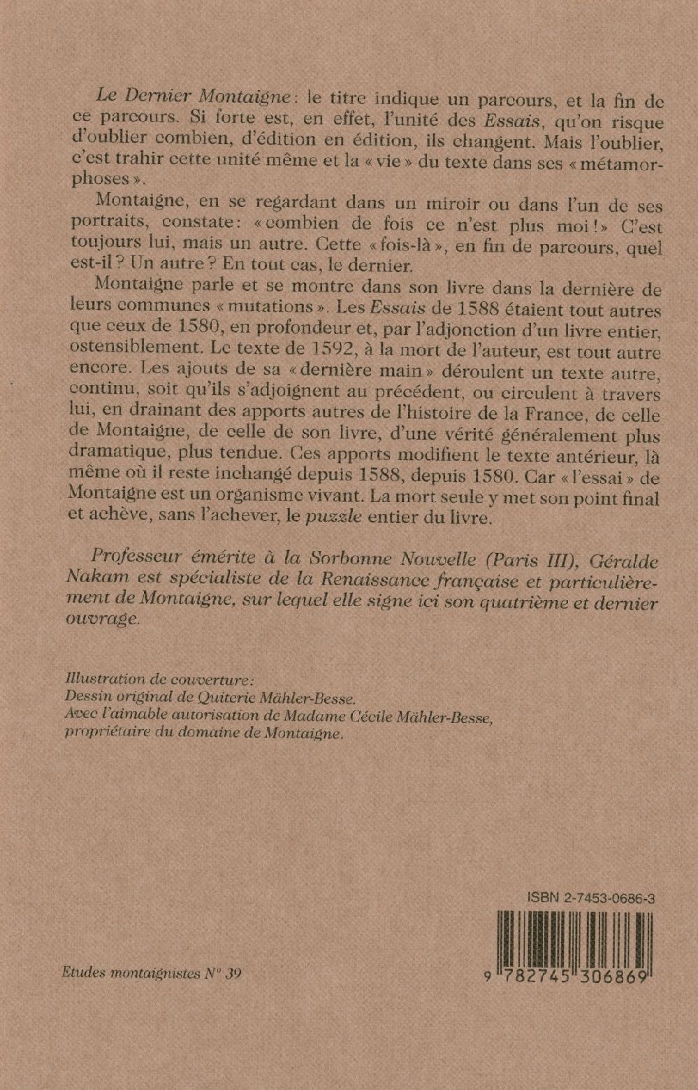 Le Dernier Montaigne: le titre indique un parcours, et la fin de ce parcours. Si forte est, en effet, l'unité des Essais, qu'on risque d'oublier combien, d'édition en édition, ils changent. Mais l'oublier, c'est trahir cette unité même et la "vie" du texte dans ses "métamorphoses". Montaigne, en se regardant dans un miroir ou dans l'un de ses portraits, constate: "combien de fois ce n'est plus moi!" C'est toujours lui, mais un autre. Cette "fois-là", en fin de parcours, quel est-il? Un autre? En tout cas, le dernier. Montaigne parle et se montre dans son livre dans la dernière de leurs communes "mutations". Les Essais de 1588 étaient tout autres que ceux de 1580, en profondeur et, par l'adjonction d'un livre entier, ostensiblement. Le texte de 1592, à la mort de l'auteur, est tout autre encore. Les ajouts de sa "dernière main" déroulent un texte autre, continu, soit qu'ils s'adjoignent au précédent, ou circulent à travers lui, en drainant des apports autres de l'histoire de la France, de celle de Montaigne, de celle de son livre, d'une vérité généralement plus dramatique, plus tendue. Ces apports modifient le texte antérieur, là même où il reste inchangé depuis 1588, depuis 1580. Car "l'essai" de Montaigne est un organisme vivant. La mort seule y met son point final et achève, sans l'achever, le puzzle entier du livre.