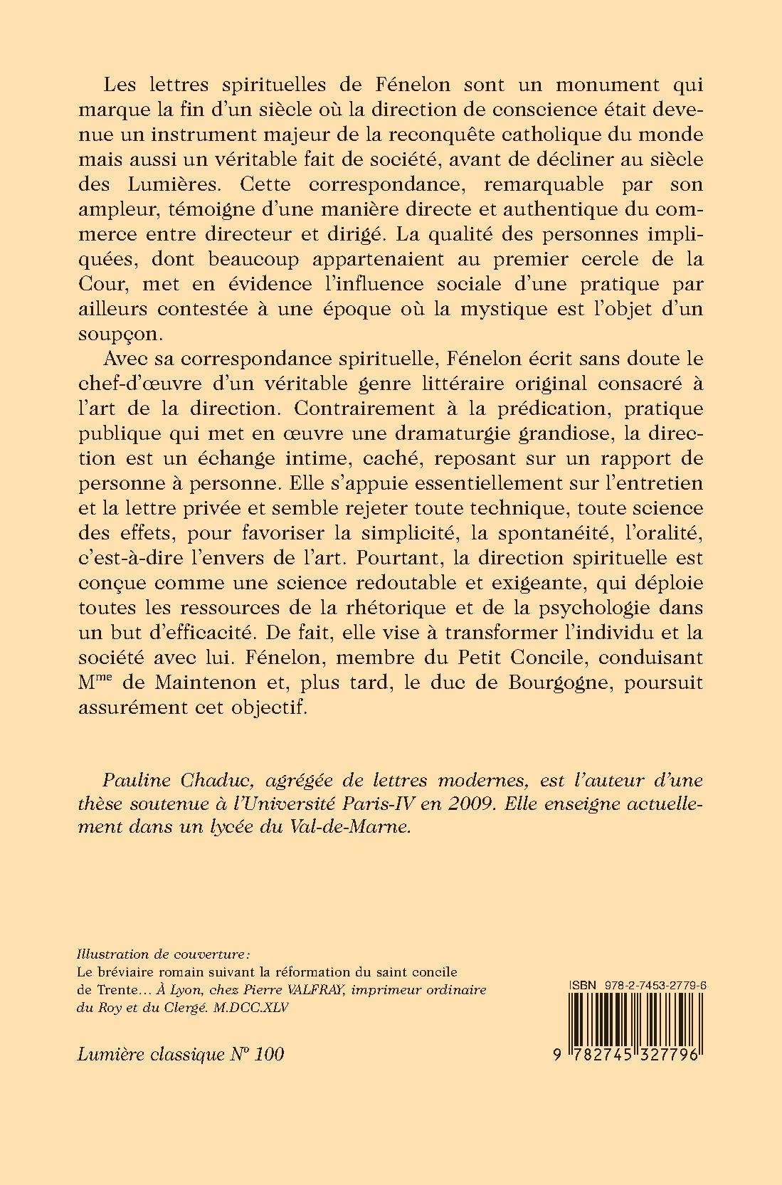 Les lettres spirituelles de Fénelon sont un monument qui marque la fin d’un siècle où la direction de conscience était devenue un instrument majeur de la reconquête catholique du monde mais aussi un véritable fait de société, avant de décliner au siècle des Lumières. Cette correspondance, remarquable par son ampleur, témoigne d’une manière directe et authentique du commerce entre directeur et dirigé. La qualité des personnes impliquées, dont beaucoup appartenaient au premier cercle de la Cour, met en évidence l’influence sociale d’une pratique par ailleurs contestée à une époque où la mystique est l’objet d’un soupçon.