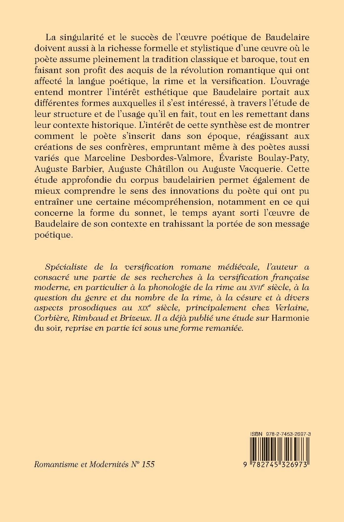 La singularité et le succès de l’oeuvre poétique de Baudelaire doivent aussi à la richesse formelle et stylistique d’une oeuvre où le poète assume pleinement la tradition classique et baroque, tout en faisant son profit des acquis de la révolution romantique qui ont affecté la langue poétique, la rime et la versification. L’ouvrage entend montrer l’intérêt esthétique que Baudelaire portait aux différentes formes auxquelles il s’est intéressé, à travers l’étude de leur structure et de l’usage qu’il en fait, tout en les remettant dans leur contexte historique. L’intérêt de cette synthèse est de montrer comment le poète s’inscrit dans son époque, réagissant aux créations de ses confrères, empruntant même à des poètes aussi variés que Marceline Desbordes-Valmore, Évariste Boulay-Paty, Auguste Barbier, Auguste Châtillon ou Auguste Vacquerie. Cette étude approfondie du corpus baudelairien permet également de mieux comprendre le sens des innovations du poète qui ont pu entraîner une certaine mécompréhension, notamment en ce qui concerne la forme du sonnet, le temps ayant sorti l’oeuvre de Baudelaire de son contexte en trahissant la portée de son message poétique.