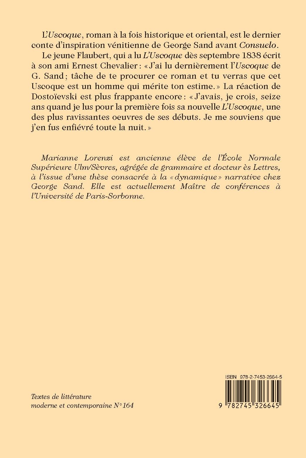L’Uscoque, roman à la fois historique et oriental, est le dernier conte d’inspiration vénitienne de George Sand avant Consuelo. Le jeune Flaubert, qui a lu L’Uscoque dès septembre 1838 écrit à son ami Ernest Chevalier : « J’ai lu dernièrement l’Uscoque de G. Sand ; tâche de te procurer ce roman et tu verras que cet Uscoque est un homme qui mérite ton estime. » La réaction de Dostoïevski est plus frappante encore : « J’avais, je crois, seize ans quand je lus pour la première fois sa nouvelle L’Uscoque, une des plus ravissantes œuvres de ses débuts. Je me souviens que j’en fus enfiévré toute la nuit. »