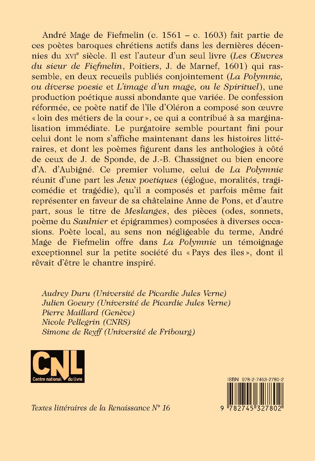 André Mage de Fiefmelin (c. 1561 – c. 1603) fait partie de ces poètes baroques chrétiens actifs dans les dernières décennies du XVIe siècle. Il est l’auteur d’un seul livre (Les OEuvres du sieur de Fiefmelin, Poitiers, J. de Marnef, 1601) qui rassemble, en deux recueils publiés conjointement (La Polymnie, ou diverse poesie et L’image d’un mage, ou le Spirituel), une production poétique aussi abondante que variée. De confession réformée, ce poète natif de l’île d’Oléron a composé son oeuvre « loin des métiers de la cour », ce qui a contribué à sa marginalisation immédiate. Le purgatoire semble pourtant fini pour celui dont le nom s’affiche maintenant dans les histoires littéraires, et dont les poèmes figurent dans les anthologies à côté de ceux de J. de Sponde, de J.-B. Chassignet ou bien encore d’A. d’Aubigné. Ce premier volume, celui de La Polymnie réunit d’une part les Jeux poetiques (églogue, moralités, tragicomédie et tragédie), qu’il a composés et parfois même fait représenter en faveur de sa châtelaine Anne de Pons, et d’autre part, sous le titre de Meslanges, des pièces (odes, sonnets, poème du Saulnier et épigrammes) composées à diverses occasions. Poète local, au sens non négligeable du terme, André Mage de Fiefmelin offre dans La Polymnie un témoignage exceptionnel sur la petite société du « Pays des îles », dont il rêvait d’être le chantre inspiré.