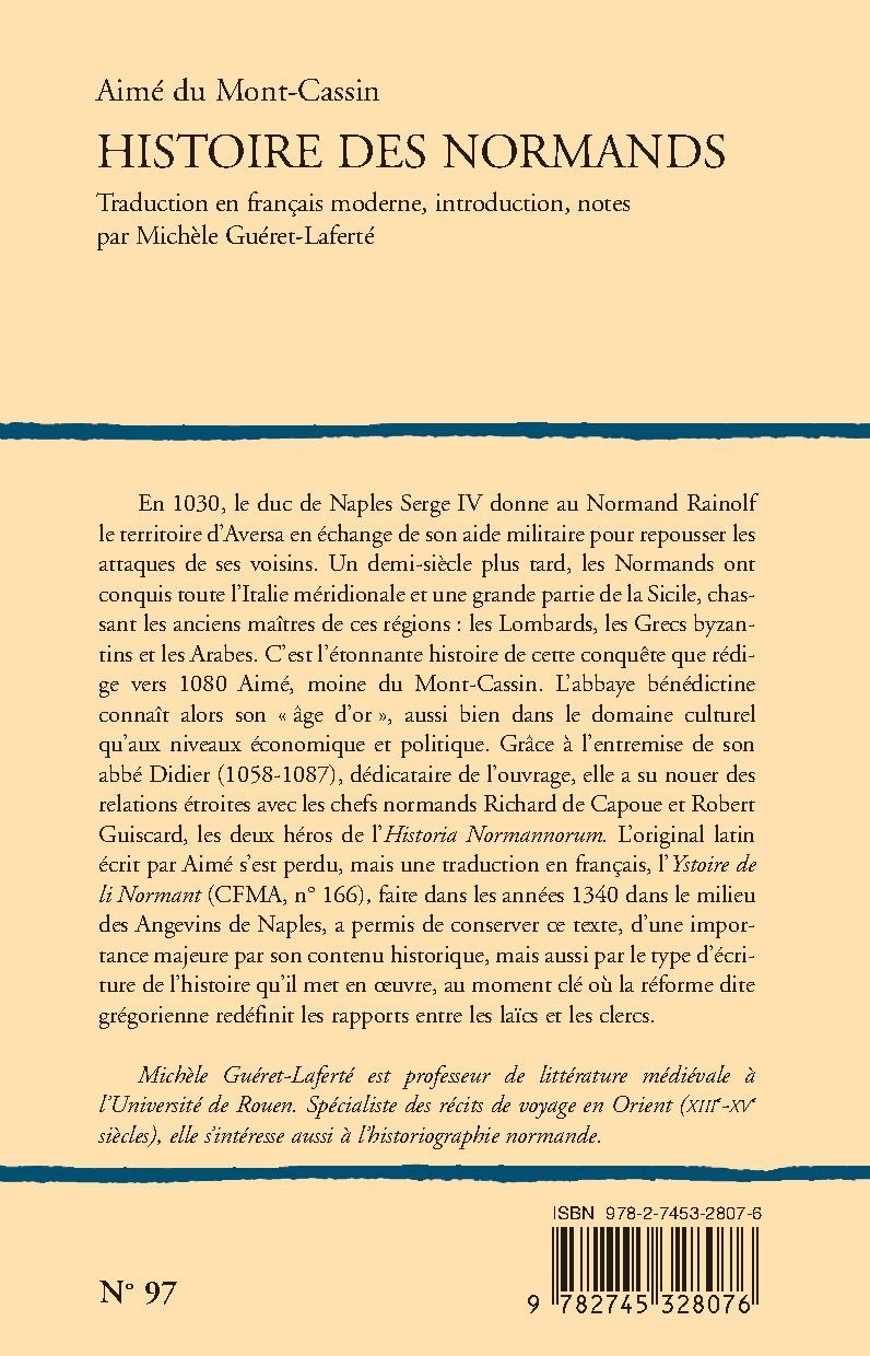 En 1030, le duc de Naples Serge IV donne au Normand Rainolf le territoire d’Aversa en échange de son aide militaire pour repousser les attaques de ses voisins. Un demi-siècle plus tard, les Normands ont conquis toute l’Italie méridionale et une grande partie de la Sicile, chassant les anciens maîtres de ces régions : les Lombards, les Grecs byzantins et les Arabes. C’est l’étonnante histoire de cette conquête que rédige vers 1080 Aimé, moine du Mont-Cassin. L’abbaye bénédictine connaît alors son « âge d’or », aussi bien dans le domaine culturel qu’aux niveaux économique et politique. Grâce à l’entremise de son abbé Didier (1058-1087), dédicataire de l’ouvrage, elle a su nouer des relations étroites avec les chefs normands Richard de Capoue et Robert Guiscard, les deux héros de l’Historia Normannorum. L’original latin écrit par Aimé s’est perdu, mais une traduction en français, l’Ystoire de li Normant (CFMA, n° 166), faite dans les années 1340 dans le milieu des Angevins de Naples, a permis de conserver ce texte, d’une importance majeure par son contenu historique, mais aussi par le type d’écriture de l’histoire qu’il met en oeuvre, au moment clé où la réforme dite grégorienne redéfinit les rapports entre les laïcs et les clercs.