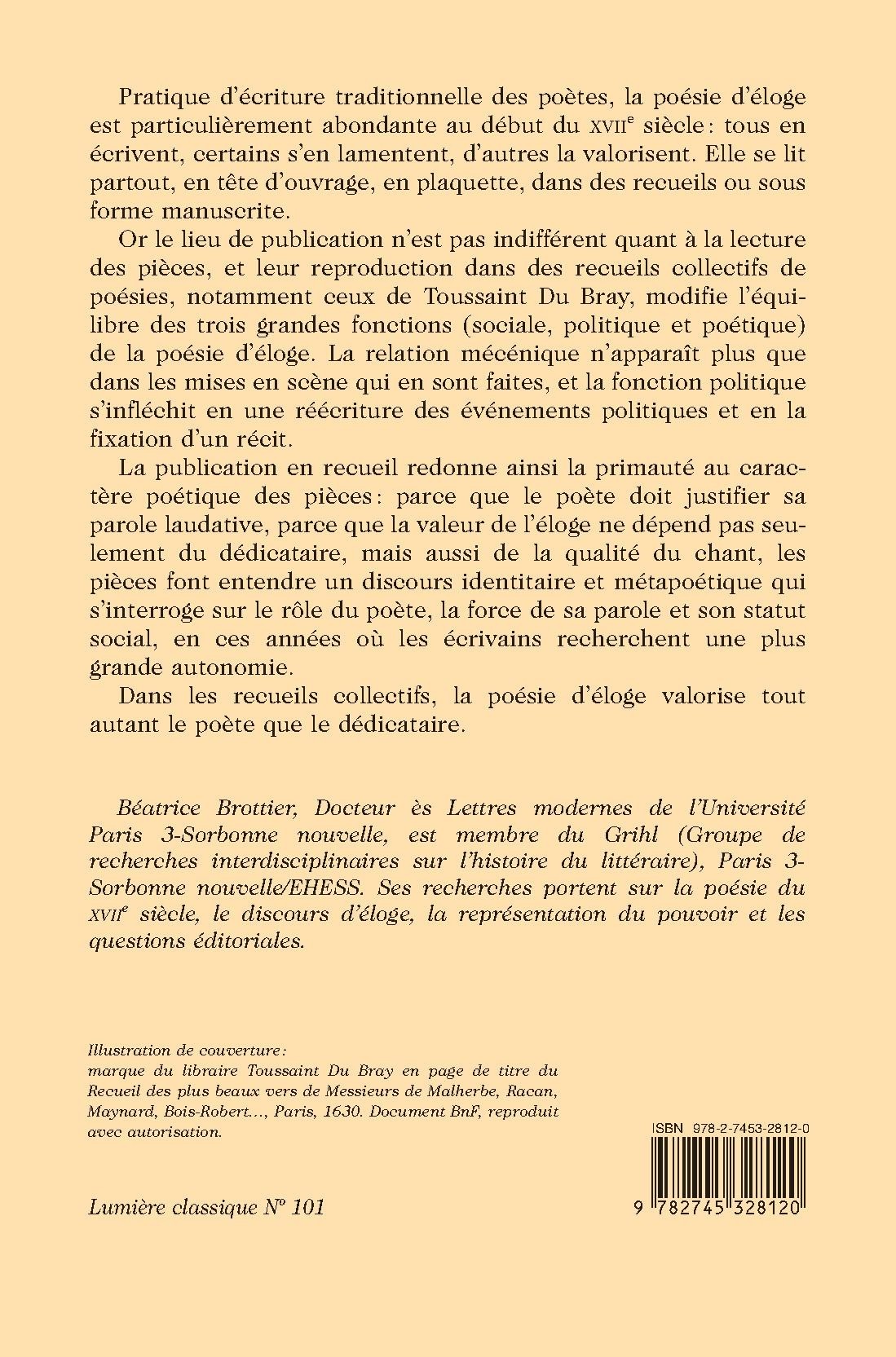 La publication en recueil redonne ainsi la primauté au caractère poétique des pièces : parce que le poète doit justifier sa parole laudative, parce que la valeur de l’éloge ne dépend pas seulement du dédicataire, mais aussi de la qualité du chant, les pièces font entendre un discours identitaire et métapoétique qui s’interroge sur le rôle du poète, la force de sa parole et son statut social, en ces années où les écrivains recherchent une plus grande autonomie.