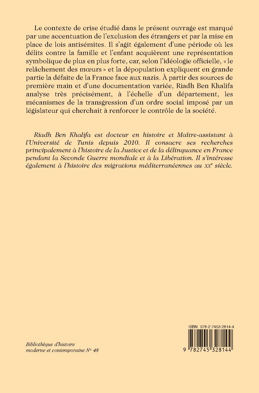 Le contexte de crise étudié dans le présent ouvrage est marqué par une accentuation de l’exclusion des étrangers et par la mise en place de lois antisémites. Il s’agit également d’une période où les délits contre la famille et l’enfant acquièrent une représentation symbolique de plus en plus forte, car, selon l’idéologie officielle, « le relâchement des moeurs » et la dépopulation expliquent en grande partie la défaite de la France face aux nazis. À partir des sources de première main et d’une documentation variée, Riadh Ben Khalifa analyse très précisément, à l’échelle d’un département, les mécanismes de la transgression d’un ordre social imposé par un législateur qui cherchait à renforcer le contrôle de la société.