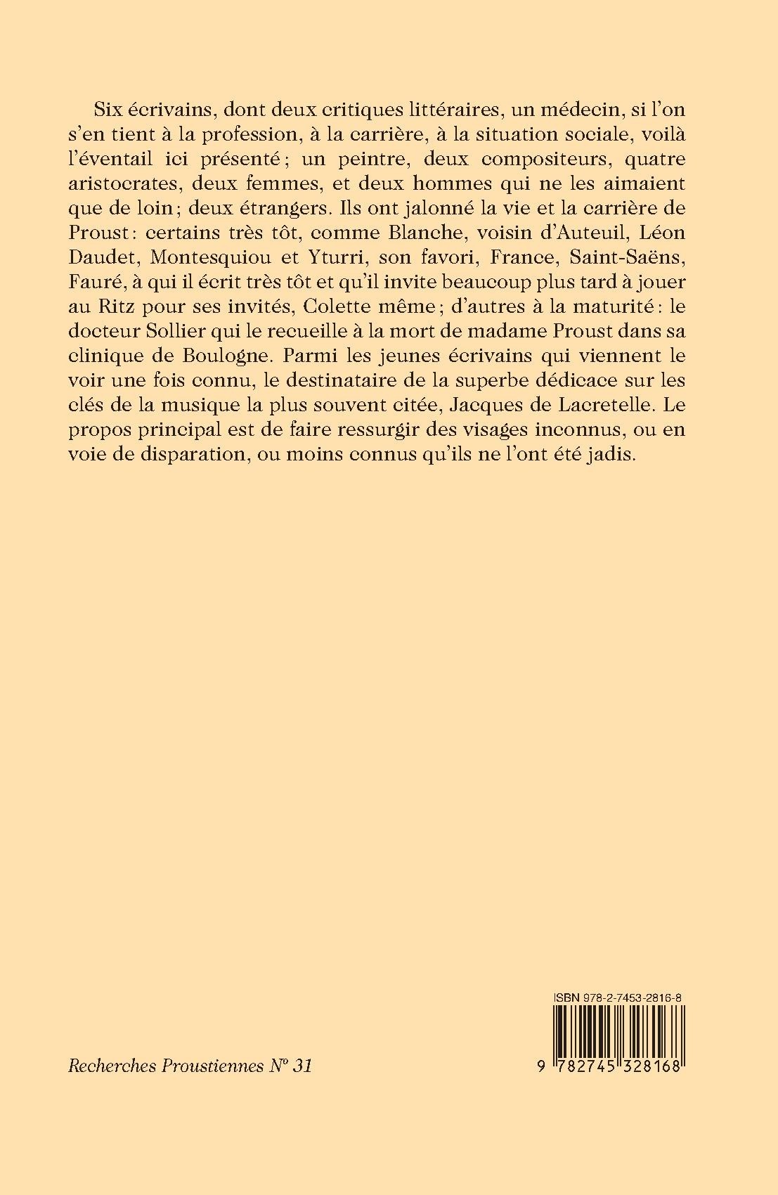 Six écrivains, dont deux critiques littéraires, un médecin, si l’on s’en tient à la profession, à la carrière, à la situation sociale, voilà l’éventail ici présenté ; un peintre, deux compositeurs, quatre aristocrates, deux femmes, et deux hommes qui ne les aimaient que de loin ; deux étrangers. Ils ont jalonné la vie et la carrière de Proust : certains très tôt, comme Blanche, voisin d’Auteuil, Léon Daudet, Montesquiou et Yturri, son favori, France, Saint-Saëns, Fauré, à qui il écrit très tôt et qu’il invite beaucoup plus tard à jouer au Ritz pour ses invités, Colette même ; d’autres à la maturité : le docteur Sollier qui le recueille à la mort de madame Proust dans sa clinique de Boulogne. Parmi les jeunes écrivains qui viennent le voir une fois connu, le destinataire de la superbe dédicace sur les clés de la musique la plus souvent citée, Jacques de Lacretelle. Le propos principal est de faire ressurgir des visages inconnus, ou en voie de disparation, ou moins connus qu’ils ne l’ont été jadis.