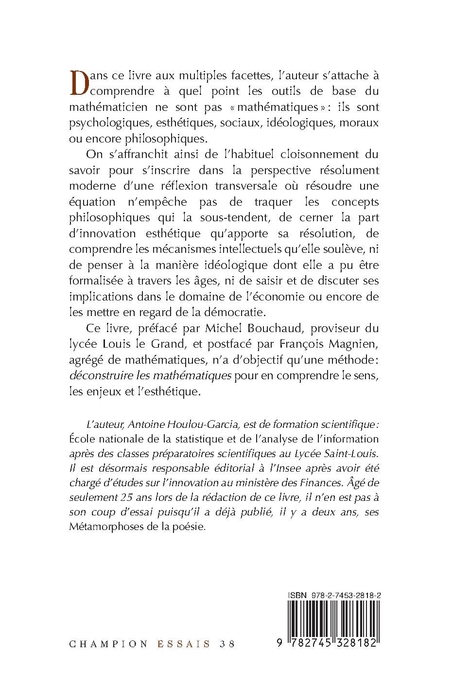 Ce livre, préfacé par Michel Bouchaud, proviseur du lycée Louis le Grand, et postfacé par François Magnien, agrégé de mathématiques, n’a d’objectif qu’une méthode : déconstruire les mathématiques pour en comprendre le sens, les enjeux et l’esthétique.