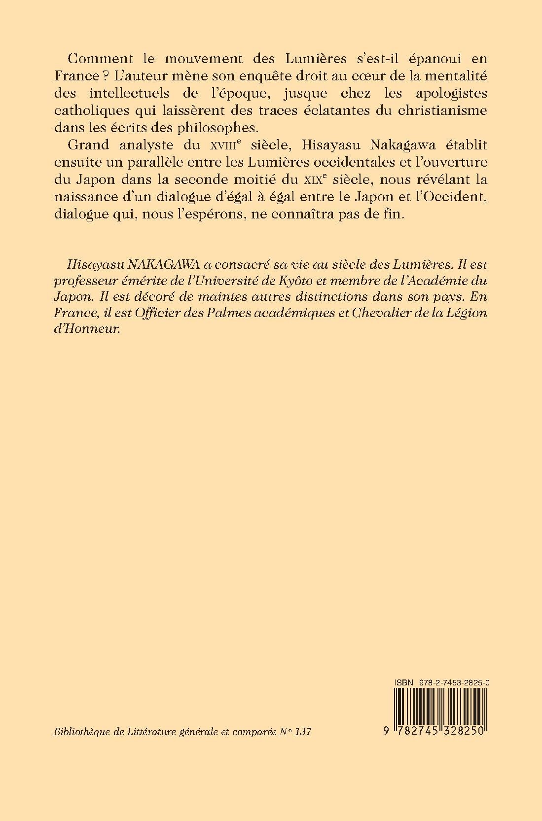 Comment le mouvement des Lumières s’est-il épanoui en France ? L’auteur mène son enquête droit au cœur de la mentalité des intellectuels de l’époque, jusque chez les apologistes catholiques qui laissèrent des traces éclatantes du christianisme dans les écrits des philosophes. Grand analyste du XVIIIe siècle, Hisayasu Nakagawa établit ensuite un parallèle entre les Lumières occidentales et l’ouverture du Japon dans la seconde moitié du XIXe siècle, nous révélant la naissance d’un dialogue d’égal à égal entre le Japon et l’Occident, dialogue qui, nous l’espérons, ne connaîtra pas de fin.