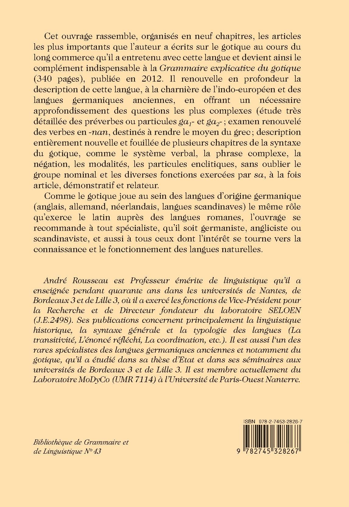 Cet ouvrage rassemble, organisés en neuf chapitres, les articles les plus importants que l’auteur a écrits sur le gotique au cours du long commerce qu’il a entretenu avec cette langue et devient ainsi le complément indispensable à la Grammaire explicative du gotique (340 pages), publiée en 2012. Il renouvelle en profondeur la description de cette langue, à la charnière de l’indo-européen et des langues germaniques anciennes, en offrant un nécessaire approfondissement des questions les plus complexes (étude très détaillée des préverbes ou particules ga1- et ga2-; examen renouvelé des verbes en -nan, destinés à rendre le moyen du grec ; description entièrement nouvelle et fouillée de plusieurs chapitres de la syntaxe du gotique, comme le système verbal, la phrase complexe, la négation, les modalités, les particules enclitiques, sans oublier le groupe nominal et les diverses fonctions exercées par sa, à la fois article, démonstratif et relateur. Comme le gotique joue au sein des langues d’origine germanique (anglais, allemand, néerlandais, langues scandinaves) le même rôle qu’exerce le latin auprès des langues romanes, l’ouvrage se recommande à tout spécialiste, qu’il soit germaniste, angliciste ou scandinaviste, et aussi à tous ceux dont l’intérêt se tourne vers la connaissance et le fonctionnement des langues naturelles.
