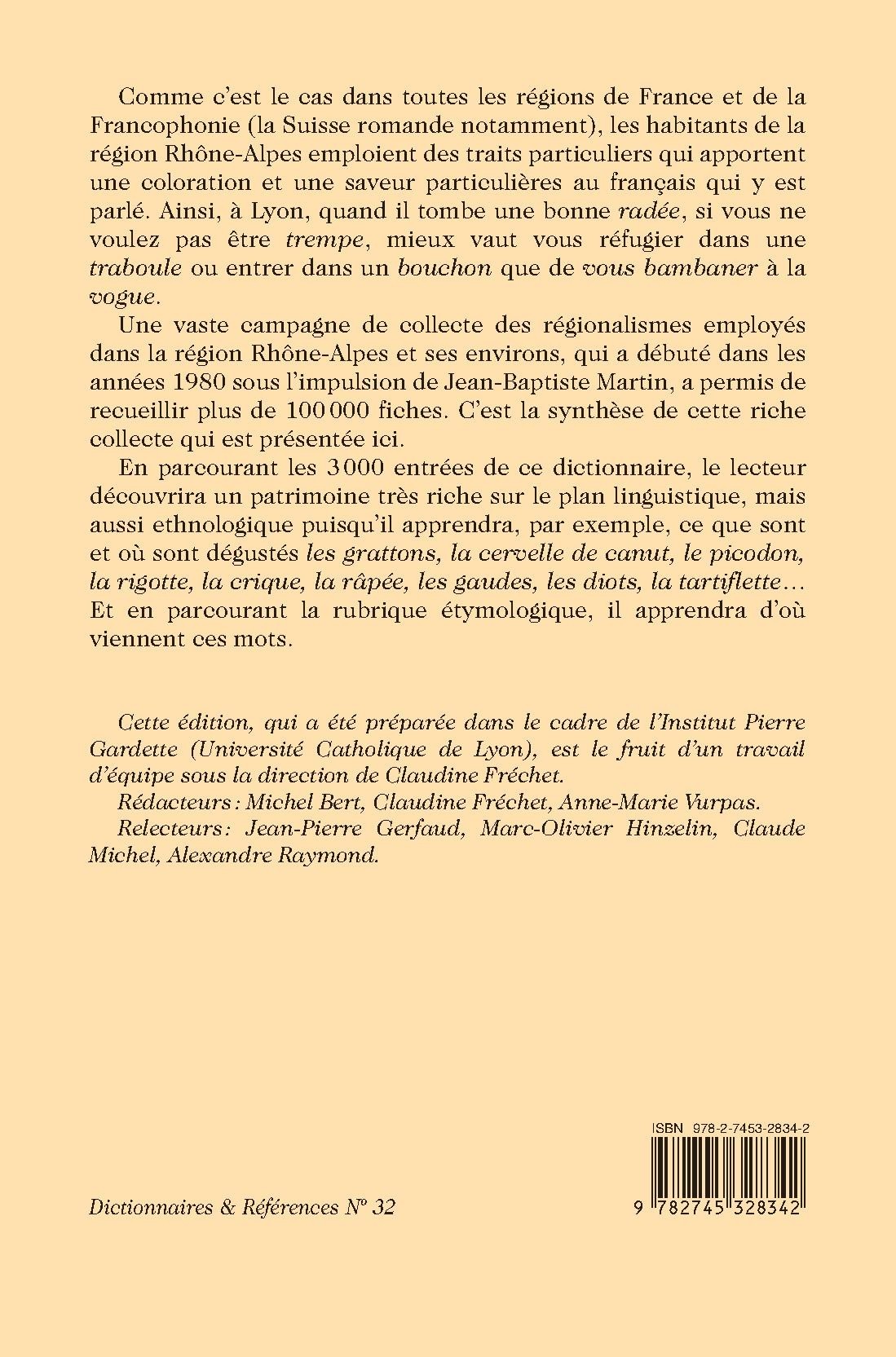 Une vaste campagne de collecte des régionalismes employés dans la région Rhône-Alpes et ses environs, qui a débuté dans les années 1980 sous l’impulsion de Jean-Baptiste Martin, a permis de recueillir plus de 100 000 fiches. C’est la synthèse de cette riche collecte qui est présentée ici. E