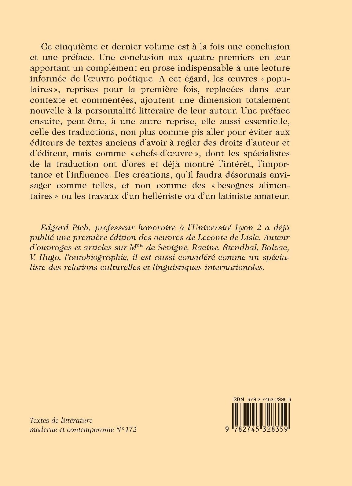 Ce cinquième et dernier volume est à la fois une conclusion et une préface. Une conclusion aux quatre premiers en leur apportant un complément en prose indispensable à une lecture informée de l’oeuvre poétique. A cet égard, les oeuvres «populaires», reprises pour la première fois, replacées dans leur contexte et commentées, ajoutent une dimension totalement nouvelle à la personnalité littéraire de leur auteur. Une préface ensuite, peut-être, à une autre reprise, elle aussi essentielle, celle des traductions, non plus comme pis aller pour éviter aux éditeurs de textes anciens d’avoir à régler des droits d’auteur et d’éditeur, mais comme « chefs-d’oeuvre », dont les spécialistes de la traduction ont d’ores et déjà montré l’intérêt, l’importance et l’influence. Des créations, qu’il faudra désormais envisager comme telles, et non comme des « besognes alimentaires » ou les travaux d’un helléniste ou d’un latiniste amateur.