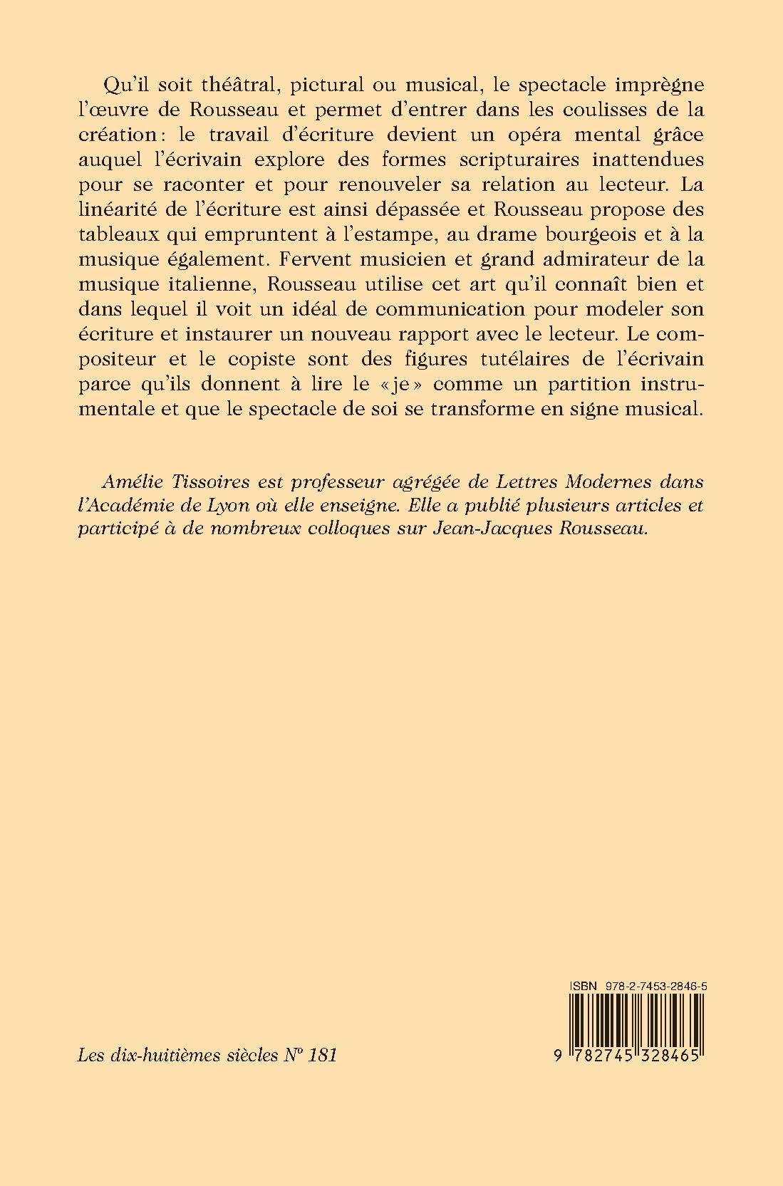 Qu’il soit théâtral, pictural ou musical, le spectacle imprègne l’oeuvre de Rousseau et permet d’entrer dans les coulisses de la création : le travail d’écriture devient un opéra mental grâce auquel l’écrivain explore des formes scripturaires inattendues pour se raconter et pour renouveler sa relation au lecteur. La linéarité de l’écriture est ainsi dépassée et Rousseau propose des tableaux qui empruntent à l’estampe, au drame bourgeois et à la musique également. Fervent musicien et grand admirateur de la musique italienne, Rousseau utilise cet art qu’il connaît bien et dans lequel il voit un idéal de communication pour modeler son écriture et instaurer un nouveau rapport avec le lecteur. Le compositeur et le copiste sont des figures tutélaires de l’écrivain parce qu’ils donnent à lire le « je » comme une partition instrumentale et que le spectacle de soi se transforme en signe musical.