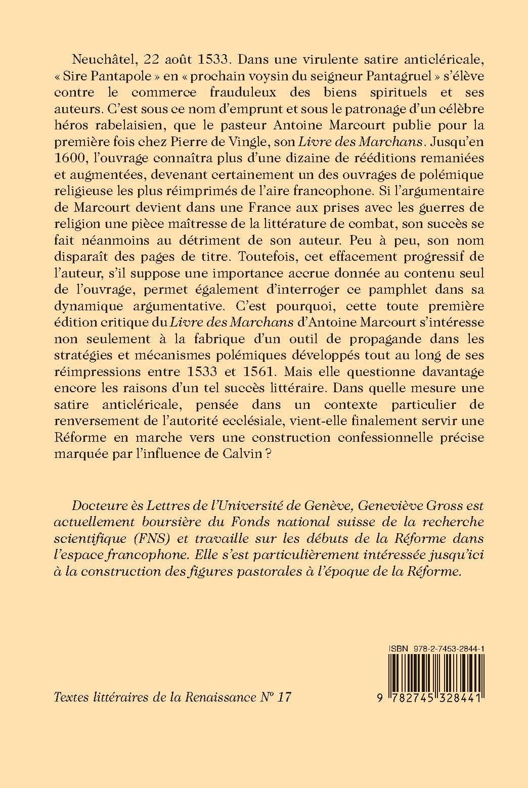 Neuchâtel, 22 août 1533. Dans une virulente satire anticléricale, « Sire Pantapole » en « prochain voysin du seigneur Pantagruel » s’élève contre le commerce frauduleux des biens spirituels et contre ses auteurs. C’est sous ce nom d’emprunt et sous le patronage d’un célèbre héros rabelaisien, que le pasteur Antoine Marcourt publie pour la première fois chez Pierre de Vingle, son Livre des Marchans. Jusqu’en 1600, l’ouvrage connaîtra plus d’une dizaine de rééditions remaniées et augmentées, devenant certainement un des ouvrages de polémique religieuse les plus réimprimés de l’aire francophone. Si l’argumentaire de Marcourt devient dans une France aux prises avec les guerres de religion une pièce maîtresse de la littérature de combat, son succès se fait néanmoins au détriment de son auteur. Peu à peu, son nom disparaît des pages de titre. Toutefois, cet effacement progressif de l’auteur, s’il suppose une importance accrue donnée au contenu seul de l’ouvrage, permet également d’interroger ce pamphlet dans sa dynamique argumentative. C’est pourquoi, cette toute première édition critique du Livre des Marchans d’Antoine Marcourt s’intéresse non seulement à la fabrique d’un outil de propagande dans les stratégies et mécanismes polémiques développés tout au long de ses réimpressions entre 1533 et 1561. Mais elle questionne davantage encore les raisons d’un tel succès littéraire. Dans quelle mesure une satire anticléricale, pensée dans un contexte particulier de renversement de l’autorité ecclésiale, vient-elle finalement servir une Réforme en marche vers une construction confessionnelle précise marquée par l’influence de Calvin ?