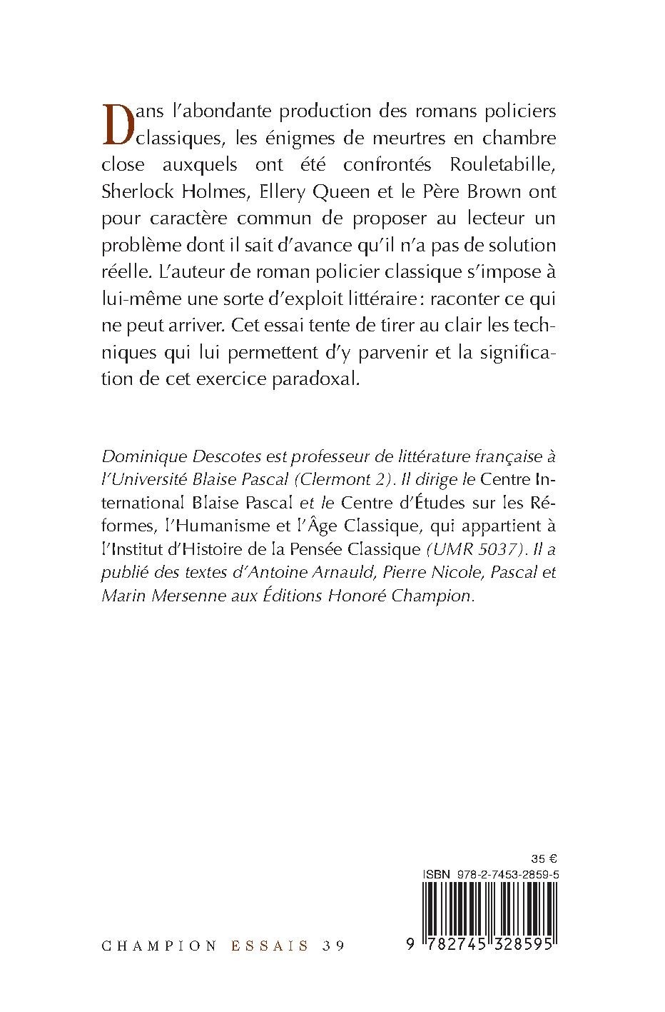 Dans l’abondante production des romans policiers classiques, les énigmes de meurtres en chambre close auxquels ont été confrontés Rouletabille, Sherlock Holmes, Ellery Queen et le Père Brown ont pour caractère commun de proposer au lecteur un problème dont il sait d’avance qu’il n’a pas de solution réelle. L’auteur de roman policier classique s’impose à lui-même une sorte d’exploit littéraire : raconter ce qui ne peut arriver. Cet essai tente de tirer au clair les techniques qui lui permettent d’y parvenir et la signification de cet exercice paradoxal.