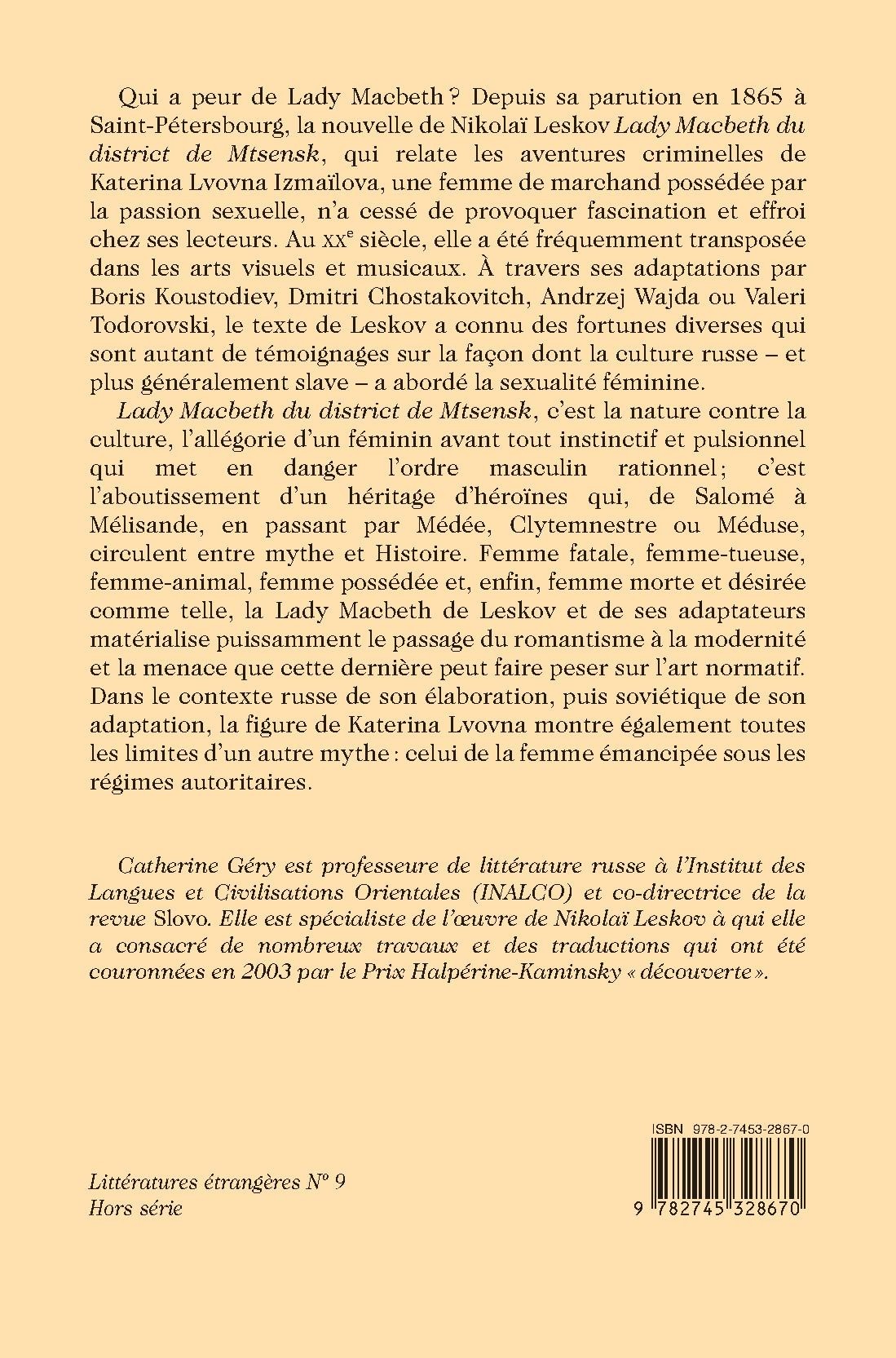 Qui a peur de Lady Macbeth ? Depuis sa parution en 1865 à Saint-Pétersbourg, la nouvelle de Nikolaï Leskov Lady Macbeth du district de Mtsensk, qui relate les aventures criminelles de Katerina Lvovna Izmaïlova, une femme de marchand possédée par la passion sexuelle, n’a cessé de provoquer fascination et effroi chez ses lecteurs. Au XXe siècle, elle a été fréquemment transposée dans les arts visuels et musicaux. À travers ses adaptations par Boris Koustodiev, Dmitri Chostakovitch, Andrzej Wajda ou Valeri Todorovski, le texte de Leskov a connu des fortunes diverses qui sont autant de témoignages sur la façon dont la culture russe – et plus généralement slave – a abordé la sexualité féminine.