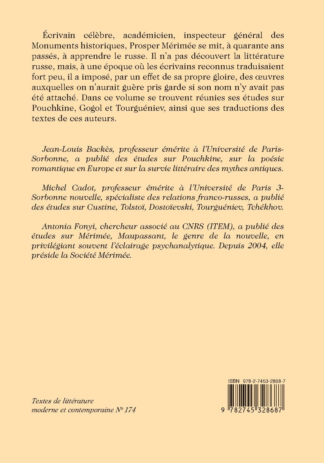 Écrivain célèbre, académicien, inspecteur général des Monuments historiques, Prosper Mérimée se mit, à quarante ans passés, à apprendre le russe. Il n’a pas découvert la littérature russe, mais, à une époque où les écrivains reconnus traduisaient fort peu, il a imposé, par un effet de sa propre gloire, des œuvres auxquelles on n’aurait guère pris garde si son nom n’y avait pas été attaché. Dans ce volume se trouvent réunies ses études sur Pouchkine, Gogol et Tourguéniev, ainsi que ses traductions des textes de ces auteurs.