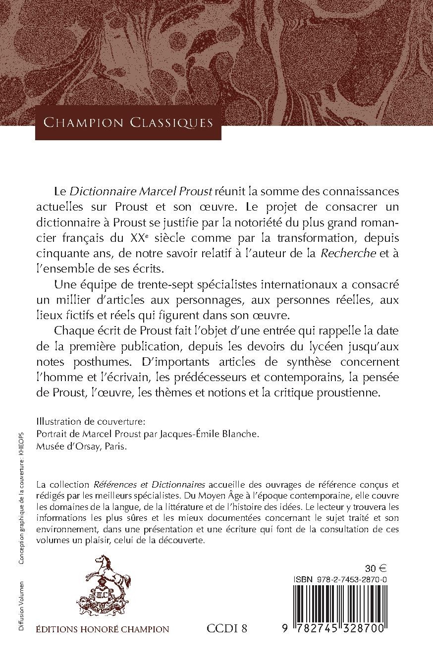 Le Dictionnaire Marcel Proust réunit la somme des connaissances actuelles sur Proust et son œuvre. Le projet de consacrer un dictionnaire à Proust se justifie par la notoriété du plus grand romancier français du XXe siècle comme par la transformation, depuis cinquante ans, de notre savoir relatif à l’auteur de la Recherche et à l’ensemble de ses écrits.