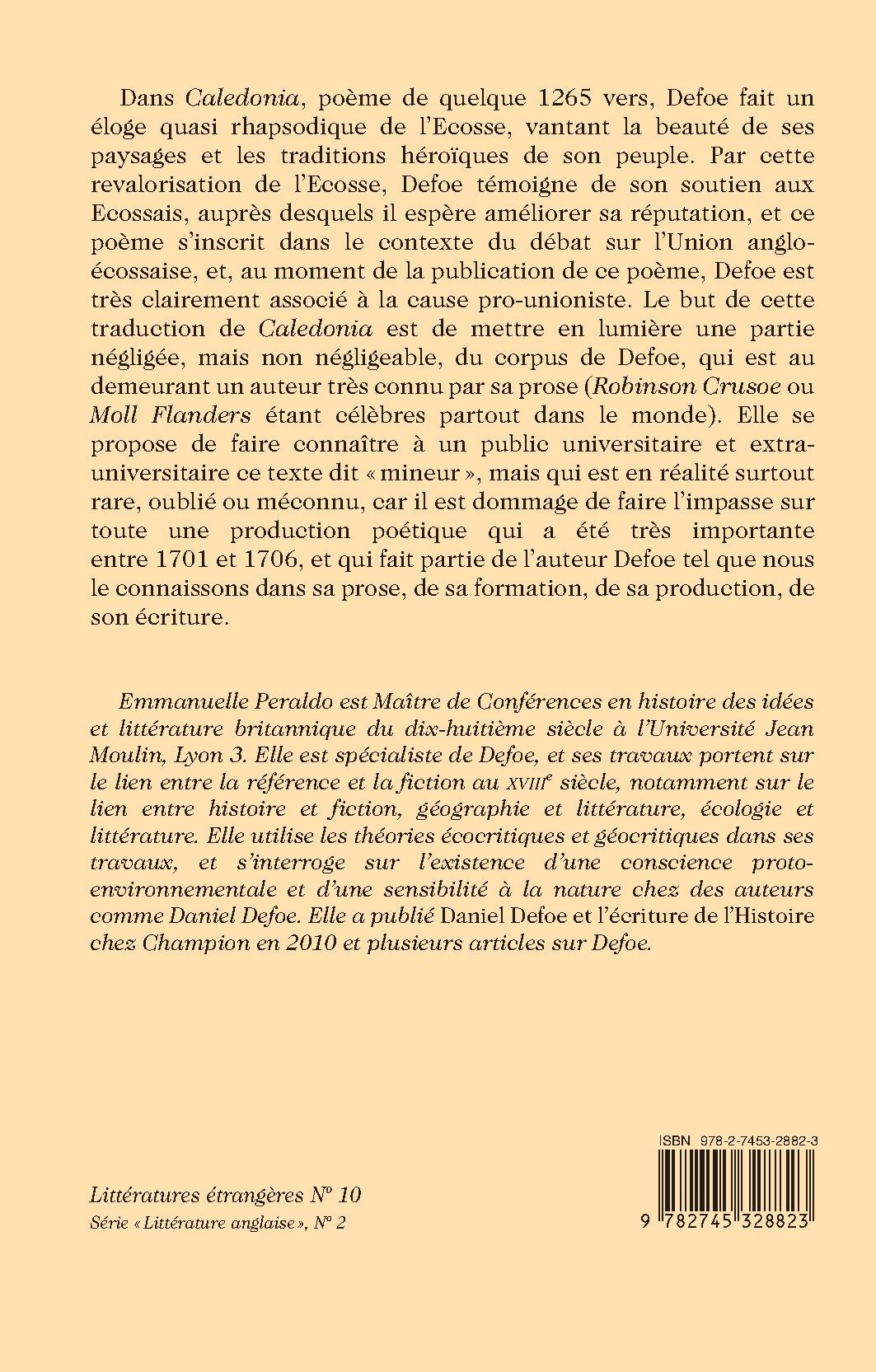 Dans Caledonia, poème de quelque 1265 vers, Defoe fait un éloge quasi rhapsodique de l’Ecosse, vantant la beauté de ses paysages et les traditions héroïques de son peuple. Par cette revalorisation de l’Ecosse, Defoe témoigne de son soutien aux Ecossais, auprès desquels il espère améliorer sa réputation, et ce poème s’inscrit dans le contexte du débat sur l’Union anglo-écossaise, et, au moment de la publication de ce poème, Defoe est très clairement associé à la cause pro-unioniste. Le but de cette traduction de Caledonia est de mettre en lumière une partie négligée, mais non négligeable, du corpus de Defoe, qui est au demeurant un auteur très connu par sa prose (Robinson Crusoe ou Moll Flanders étant célèbres partout dans le monde). Elle se propose de faire connaître à un public universitaire et extra-universitaire ce texte dit «mineur », mais qui est en réalité surtout rare, oublié ou méconnu, car il est dommage de faire l’impasse sur toute une production poétique qui a été très importante entre 1701 et 1706, et qui fait partie de l’auteur Defoe tel que nous le connaissons dans sa prose, de sa formation, de sa production, de son écriture.