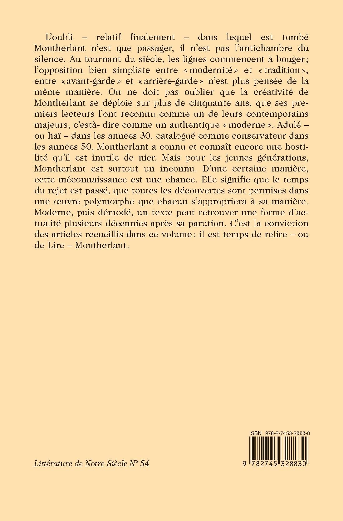 L’oubli – relatif finalement – dans lequel est tombé Montherlant n’est que passager, il n’est pas l’antichambre du silence. Au tournant du siècle, les lignes commencent à bouger ; l’opposition bien simpliste entre « modernité » et « tradition »,entre « avant-garde » et « arrière-garde » n’est plus pensée de la même manière. On ne doit pas oublier que la créativité de Montherlant se déploie sur plus de cinquante ans, que ses premiers lecteurs l’ont reconnu comme un de leurs contemporains majeurs, c’est à- dire comme un authentique «moderne ». Adulé –ou haï – dans les années 30, catalogué comme conservateur dans les années 50, Montherlant a connu et connaît encore une hostilité qu’il est inutile de nier. Mais pour les jeunes générations, Montherlant est surtout un inconnu. D’une certaine manière, cette méconnaissance est une chance. Elle signifie que le temps du rejet est passé, que toutes les découvertes sont permises dans une œuvre polymorphe que chacun s’appropriera à sa manière. Moderne, puis démodé, un texte peut retrouver une forme d’actualité plusieurs décennies après sa parution. C’est la conviction des articles recueillis dans ce volume : il est temps de relire – ou de Lire – Montherlant.