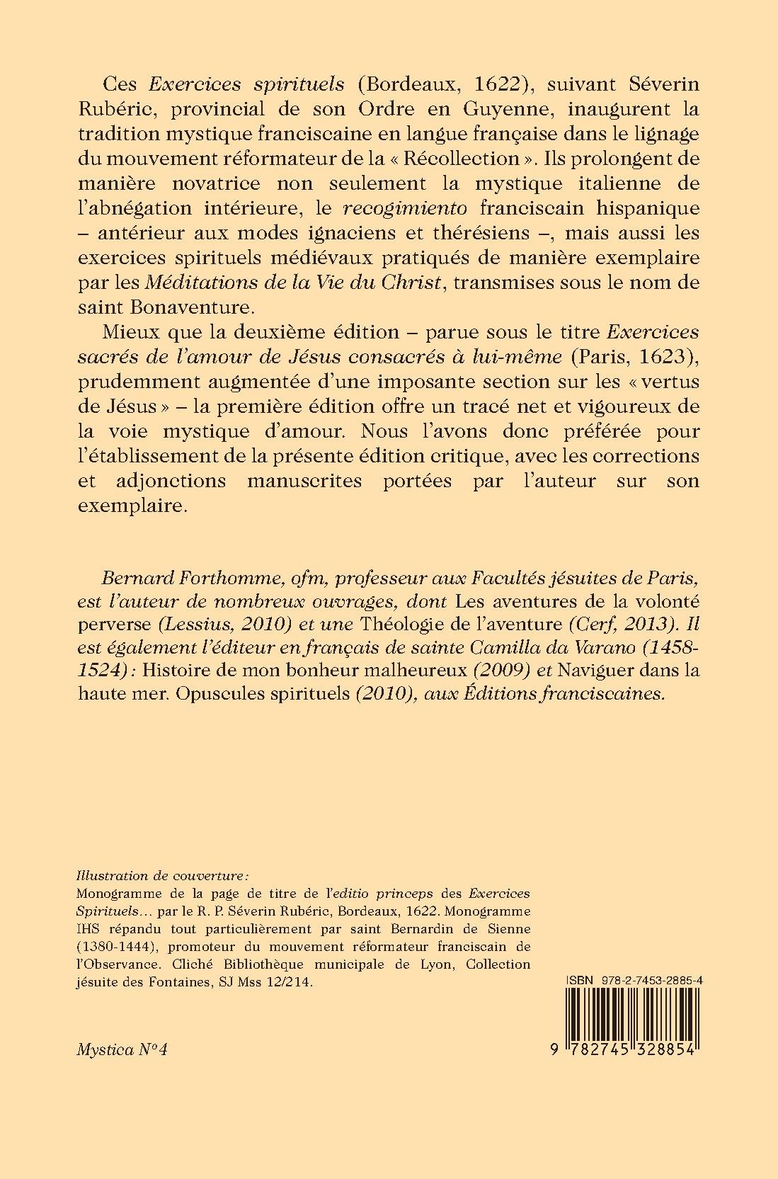 Ces Exercices spirituels (Bordeaux, 1622), suivant Séverin Rubéric, provincial de son Ordre en Guyenne, inaugurent la tradition mystique franciscaine en langue française dans le lignage du mouvement réformateur de la « Récollection ». Ils prolongent de manière novatrice non seulement la mystique italienne de l’abnégation intérieure, le recogimiento franciscain hispanique – antérieur aux modes ignaciens et thérésiens –, mais aussi les exercices spirituels médiévaux pratiqués de manière exemplaire par les Méditations de la Vie du Christ, transmises sous le nom de saint Bonaventure.