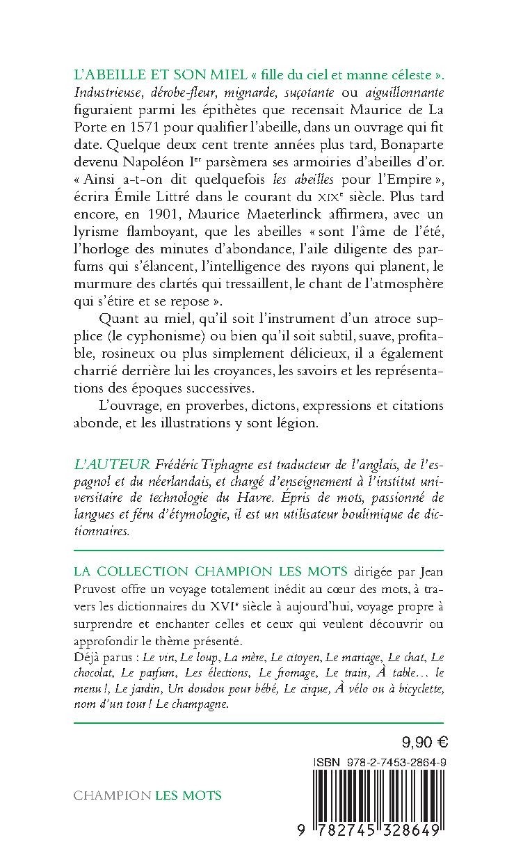 L’ABEILLE ET SON MIEL « fille du ciel et manne céleste ». Industrieuse, dérobe-fleur, mignarde, suçotante ou aiguillonnante figuraient parmi les épithètes que recensait Maurice de La Porte en 1571 pour qualifier l’abeille, dans un ouvrage qui fit date. Quelque deux cent trente années plus tard, Bonaparte devenu Napoléon Ier parsèmera ses armoiries d’abeilles d’or. « Ainsi a-t-on dit quelquefois les abeilles pour l’Empire », écrira Émile Littré dans le courant du XIXe siècle. Plus tard encore, en 1901, Maurice Maeterlinck affirmera, avec un lyrisme flamboyant, que les abeilles « sont l’âme de l’été, l’horloge des minutes d’abondance, l’aile diligente des parfums qui s’élancent, l’intelligence des rayons qui planent, le murmure des clartés qui tressaillent, le chant de l’atmosphère qui s’étire et se repose ». Quant au miel, qu’il soit l’instrument d’un atroce supplice (le cyphonisme) ou bien qu’il soit subtil, suave, profitable, rosineux ou plus simplement délicieux, il a également charrié derrière lui les croyances, les savoirs et les représentations des époques successives. L’ouvrage, en proverbes, dictons, expressions et citations abonde, et les illustrations y sont légion.