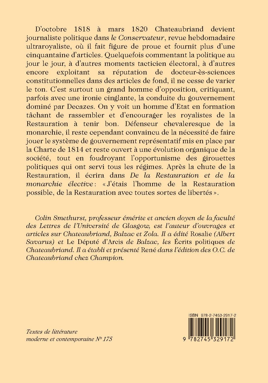 D’octobre 1818 à mars 1820 Chateaubriand devient journaliste politique dans le Conservateur, revue hebdomadaire ultraroyaliste, où il fait figure de proue et fournit plus d’une cinquantaine d’articles. Quelquefois commentant la politique au jour le jour, à d’autres moments tacticien électoral, à d’autres encore exploitant sa réputation de docteur-ès-sciences constitutionnelles dans des articles de fond, il ne cesse de varier le ton. C’est surtout un grand homme d’opposition, critiquant, parfois avec une ironie cinglante, la conduite du gouvernement dominé par Decazes. On y voit un homme d’État en formation tâchant de rassembler et d’encourager les royalistes de la Restauration à tenir bon. Défenseur chevaleresque de la monarchie, il reste cependant convaincu de la nécessité de faire jouer le système de gouvernement représentatif mis en place par la Charte de 1814 et reste ouvert à une évolution organique de la société, tout en foudroyant l’opportunisme des girouettes politiques qui ont servi tous les régimes. Après la chute de la Restauration, il écrira dans De la Restauration et de la monarchie élective : « J’étais l’homme de la Restauration possible, de la Restauration avec toutes sortes de libertés ».