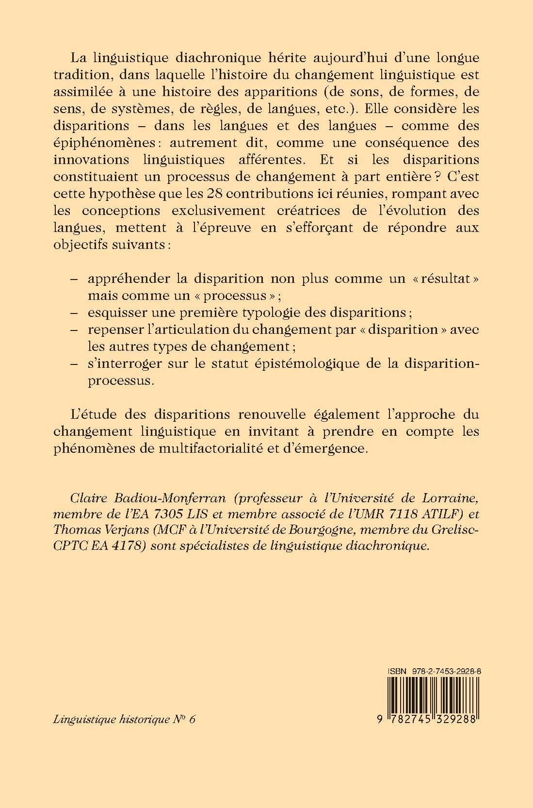 La linguistique diachronique hérite aujourd’hui d’une longue tradition, dans laquelle l’histoire du changement linguistique est assimilée à une histoire des apparitions (de sons, de formes, de sens, de systèmes, de règles, de langues, etc.). Elle considère les disparitions – dans les langues et des langues – comme des épiphénomènes : autrement dit, comme une conséquence des innovations linguistiques afférentes. Et si les disparitions constituaient un processus de changement à part entière? C’est cette hypothèse que les 28 contributions ici réunies, rompant avec les conceptions exclusivement créatrices de l’évolution des langues, mettent à l’épreuve en s’efforçant de répondre aux objectifs suivants :