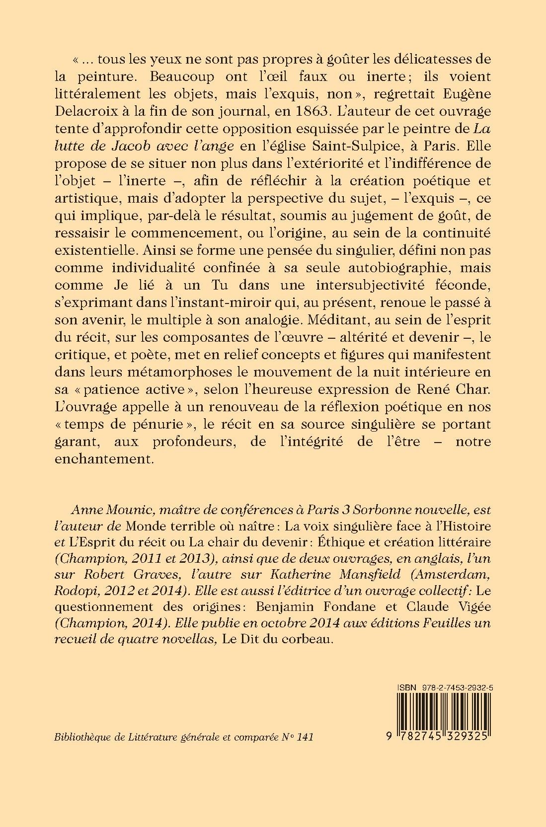 « ... tous les yeux ne sont pas propres à goûter les délicatesses de la peinture. Beaucoup ont l’oeil faux ou inerte ; ils voient littéralement les objets, mais l’exquis, non », regrettait Eugène Delacroix à la fin de son journal, en 1863. L’auteur de cet ouvrage tente d’approfondir cette opposition esquissée par le peintre de La lutte de Jacob avec l'ange en l’église Saint-Sulpice, à Paris. Elle propose de se situer non plus dans l’extériorité et l’indifférence de l’objet – l’inerte –, afin de réfléchir à la création poétique et artistique, mais d’adopter la perspective du sujet, – l’exquis –, ce qui implique, par-delà le résultat, soumis au jugement de goût, de ressaisir le commencement, ou l’origine, au sein de la continuité existentielle. Ainsi se forme une pensée du singulier, défini non pas comme individualité confinée à sa seule autobiographie, mais comme Je lié à un Tu dans une intersubjectivité féconde, s’exprimant dans l’instant-miroir qui, au présent, renoue le passé à son avenir, le multiple à son analogie. Méditant, au sein de l’esprit du récit, sur les composantes de l’oeuvre – altérité et devenir –, le critique, et poète, met en relief concepts et figures qui manifestent dans leurs métamorphoses le mouvement de la nuit intérieure en sa «patience active », selon l’heureuse expression de René Char. L’ouvrage appelle à un renouveau de la réflexion poétique en nos « temps de pénurie », le récit en sa source singulière se portant garant, aux profondeurs, de l’intégrité de l’être – notre enchantement.