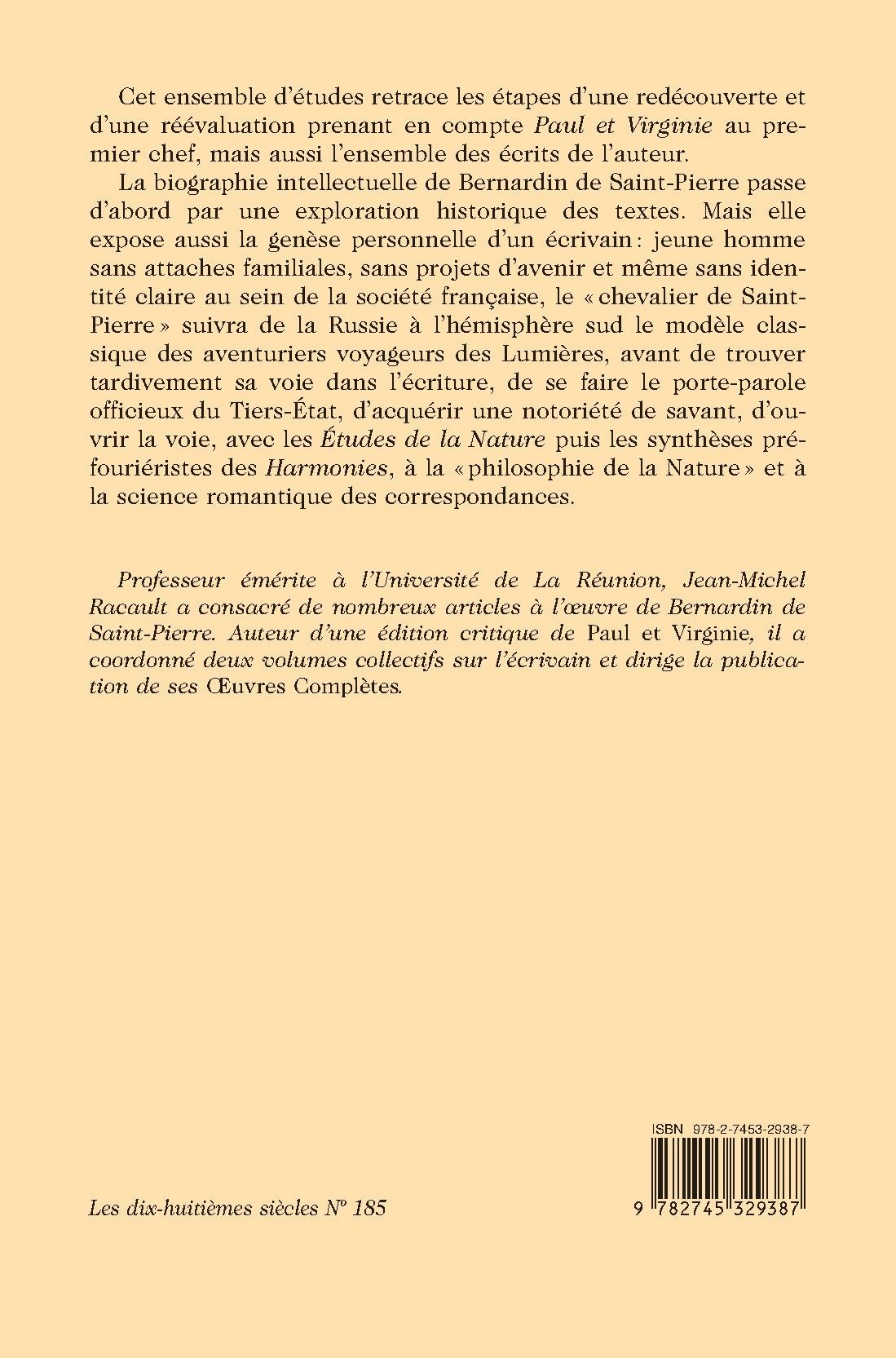 Professeur émérite à l’Université de La Réunion, Jean-Michel Racault a consacré de nombreux articles à l’œuvre de Bernardin de Saint-Pierre. Auteur d’une édition critique de Paul et Virginie, il a coordonné deux volumes collectifs sur l’écrivain et dirige la publication de ses Œuvres Complètes.