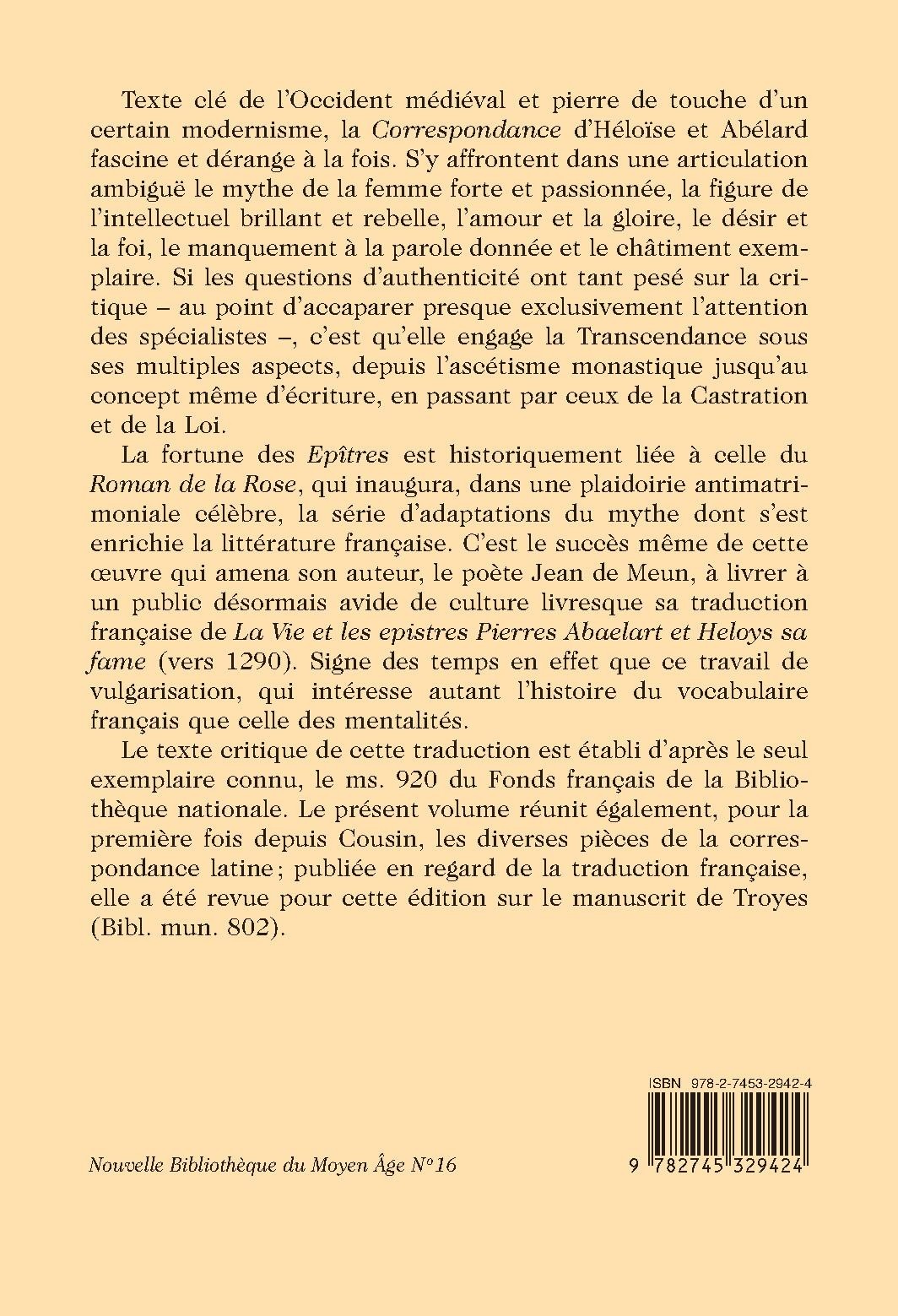 La fortune des Epîtres est historiquement liée à celle du Roman de la Rose, qui inaugura, dans une plaidoirie antimatrimoniale célèbre, la série d’adaptations du mythe dont s’est enrichie la littérature française. C’est le succès même de cette oeuvre qui amena son auteur, le poète Jean de Meun, à livrer à un public désormais avide de culture livresque sa traduction française de la Vie et les epistres Pierre Abaelart et Heloys sa fame (vers 1290). Signe des temps en effet que ce travail de vulgarisation, qui intéresse autant l’histoire du vocabulaire français que celle des mentalités.