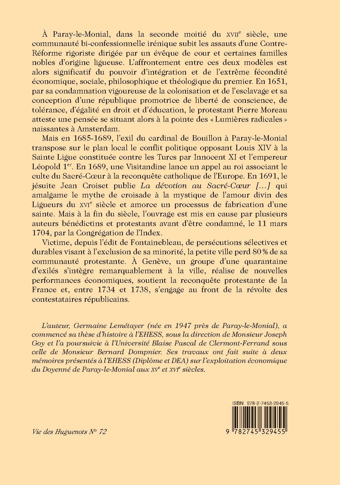 L’auteur, Germaine Lemétayer (née en 1947 près de Paray-le-Monial), a commencé sa thèse d’histoire à l’EHESS, sous la direction de Monsieur Joseph Goy et l’a poursuivie à l’Université Blaise Pascal de Clermont-Ferrand sous celle de Monsieur Bernard Dompnier. Ses travaux ont fait suite à deux mémoires présentés à l’EHESS (Diplôme et DEA) sur l’exploitation économique du Doyenné de Paray-le-Monial aux XVe et XVIe siècles.
