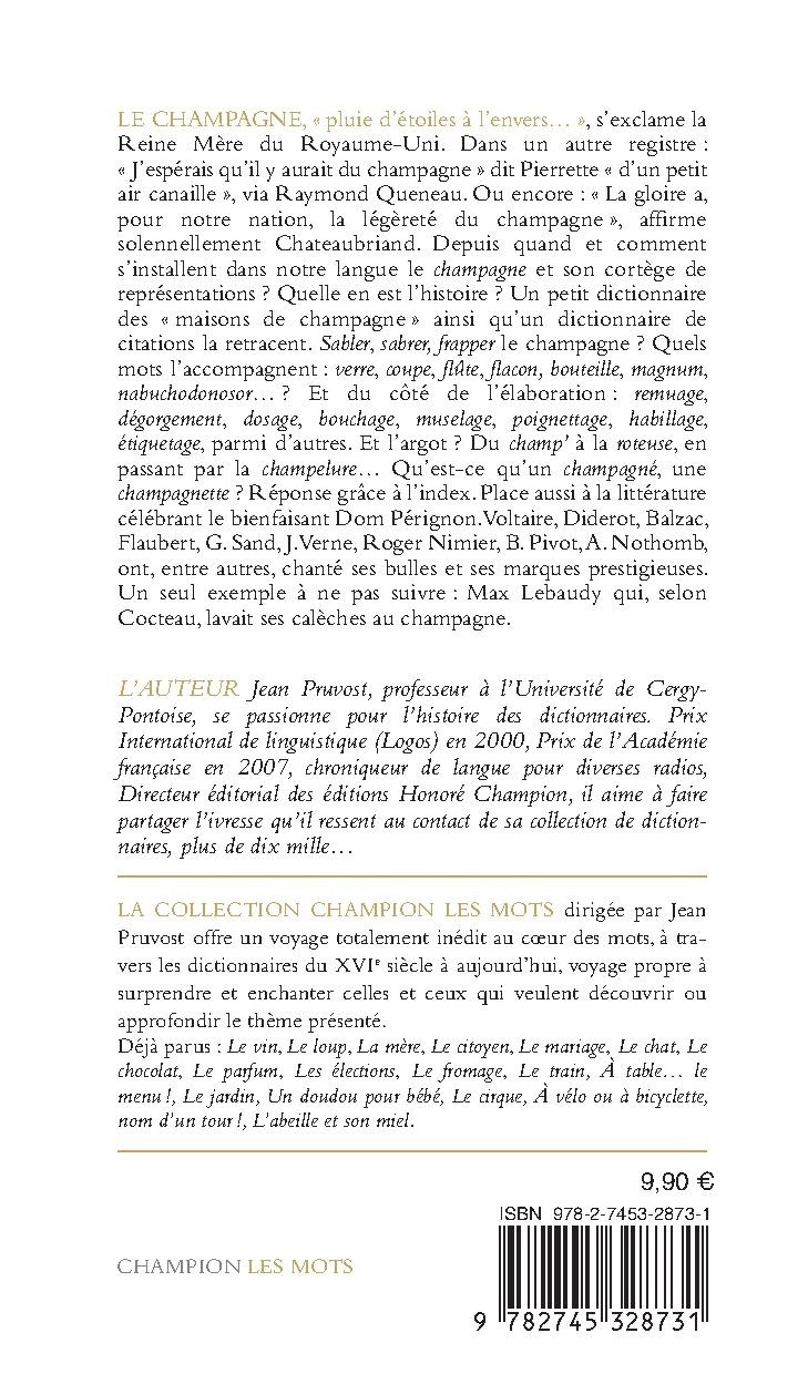 LE CHAMPAGNE, « pluie d’étoiles à l’envers… », s’exclame la Reine Mère du Royaume- Uni. Dans un autre registre : « J’espérais qu’il y aurait du champagne » dit Pierrette « d’un petit air canaille », via Raymond Queneau. Ou encore : « La gloire a, pour notre nation, la légèreté du champagne », affirme solennellement Chateaubriand. Depuis quand et comment s’installent dans notre langue le champagne et son cortège de représentations ? Quelle en est l’histoire ? Un petit dictionnaire des « maisons de champagne » ainsi qu’un dictionnaire de citations la retrace. Sabler, sabrer, frapper le champagne ? Quels mots l’accompagnent : verre, coupe, flûte, flacon, bouteille, magnum, nabuchodonosor… ? Et du côté de l’élaboration : remuage, dégorgement, dosage, bouchage, muselage, poignettage, habillage, étiquetage, parmi d’autres. Et l’argot ? Du champ’à la roteuse, en passant par la champelure… Qu’est-ce qu’un champagné, une champagnette ? Réponse grâce à l’index. Place aussi à la littérature célébrant le bienfaisant Dom Pérignon. Voltaire, Diderot, Balzac, Flaubert, G. Sand, J.Verne, Roger Nimier, B. Pivot, A. Nothomb, ont, entre autres, chanté ses bulles et ses marques prestigieuses. Un seul exemple à ne pas suivre : Max Lebaudy qui, selon Cocteau, lavait ses calèches au champagne.