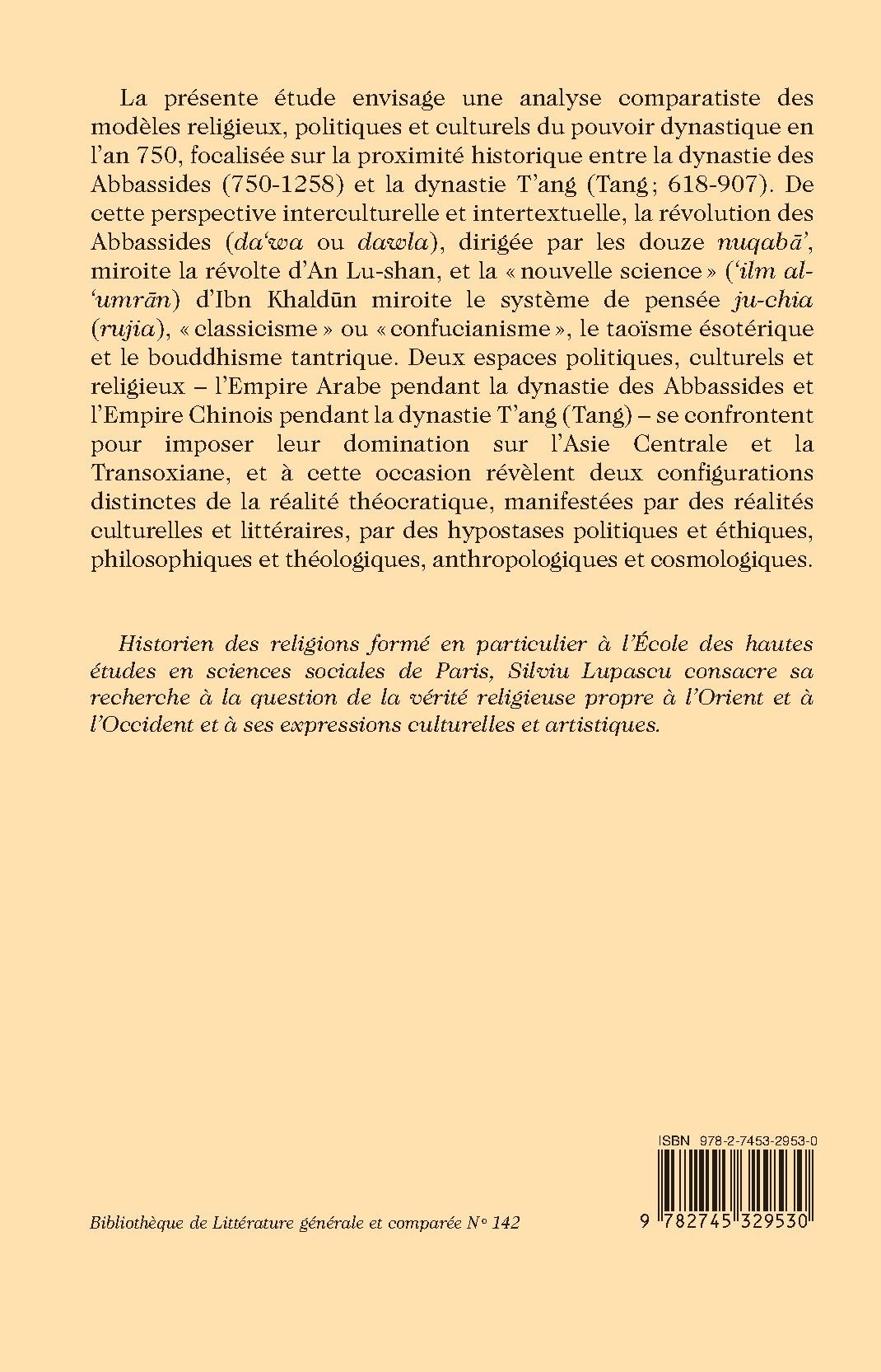 La présente étude envisage une analyse comparatiste des modèles religieux, politiques et culturels du pouvoir dynastique en l’an 750, focalisée sur la proximité historique entre la dynastie des Abbassides (750-1258) et la dynastie T’ang (Tang ; 618-907). De cette perspective interculturelle et intertextuelle, la révolution des Abbassides (da‘wa ou dawla), dirigée par les douze nuqab?’, miroite la révolte d’An Lu-shan, et la « nouvelle science » (‘ilm al- ‘umr?n) d’Ibn Khald?n miroite le système de pensée ju-chia (rujia), « classicisme » ou « confucianisme », le taoïsme ésotérique et le bouddhisme tantrique. Deux espaces politiques, culturels et religieux – l’Empire Arabe pendant la dynastie des Abbassides et l’Empire Chinois pendant la dynastie T’ang (Tang) – se confrontent pour imposer leur domination sur l’Asie Centrale et la Transoxiane, et à cette occasion révèlent deux configurations distinctes de la réalité théocratique, manifestées par des réalités culturelles et littéraires, par des hypostases politiques et éthiques, philosophiques et théologiques, anthropologiques et cosmologiques.