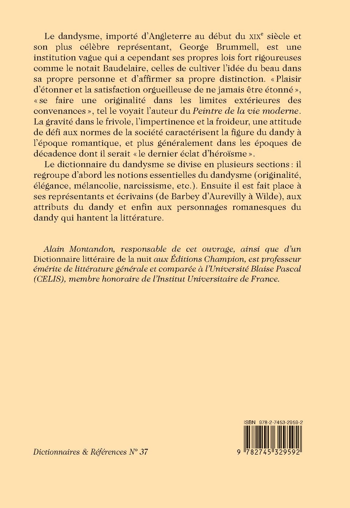 Le dandysme, importé d’Angleterre au début du XIXe siècle et son plus célèbre représentant, George Brummell, est une institution vague qui a cependant ses propres lois fort rigoureuses comme le notait Baudelaire, celles de cultiver l’idée du beau dans sa propre personne et d’affirmer sa propre distinction. « Plaisir d’étonner et la satisfaction orgueilleuse de ne jamais être étonné », « se faire une originalité dans les limites extérieures des convenances », tel le voyait l’auteur du Peintre de la vie moderne. La gravité dans le frivole, l’impertinence et la froideur, une attitude de défi aux normes de la société caractérisent la figure du dandy à l’époque romantique, et plus généralement dans les époques de décadence dont il serait « le dernier éclat d’héroïsme ». Le dictionnaire du dandysme se divise en plusieurs sections : il regroupe d’abord les notions essentielles du dandysme (originalité, élégance, mélancolie, narcissisme, etc.). Ensuite il est fait place à ses représentants et écrivains (de Barbey d’Aurevilly à Wilde), aux attributs du dandy et enfin aux personnages romanesques du dandy qui hantent la littérature.