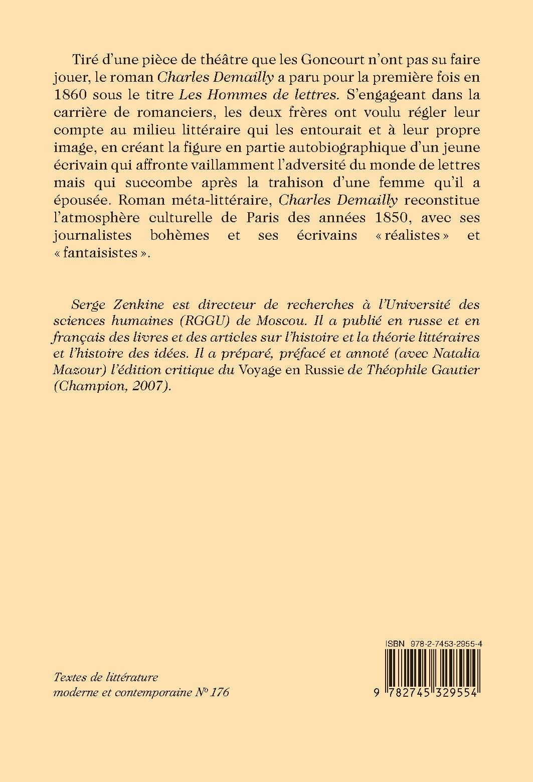 Tiré d’une pièce de théâtre que les Goncourt n’ont pas su faire jouer, le roman Charles Demailly a paru pour la première fois en 1860 sous le titre Les Hommes de lettres. S’engageant dans la carrière de romanciers, les deux frères ont voulu régler leur compte au milieu littéraire qui les entourait et à leur propre image, en créant la figure en partie autobiographique d’un jeune écrivain qui affronte vaillamment l’adversité du monde de lettres mais qui succombe après la trahison d’une femme qu’il a épousée. Roman méta-littéraire, Charles Demailly reconstitue l’atmosphère culturelle de Paris des années 1850, avec ses journalistes bohèmes et ses écrivains «réalistes » et « fantaisistes ».