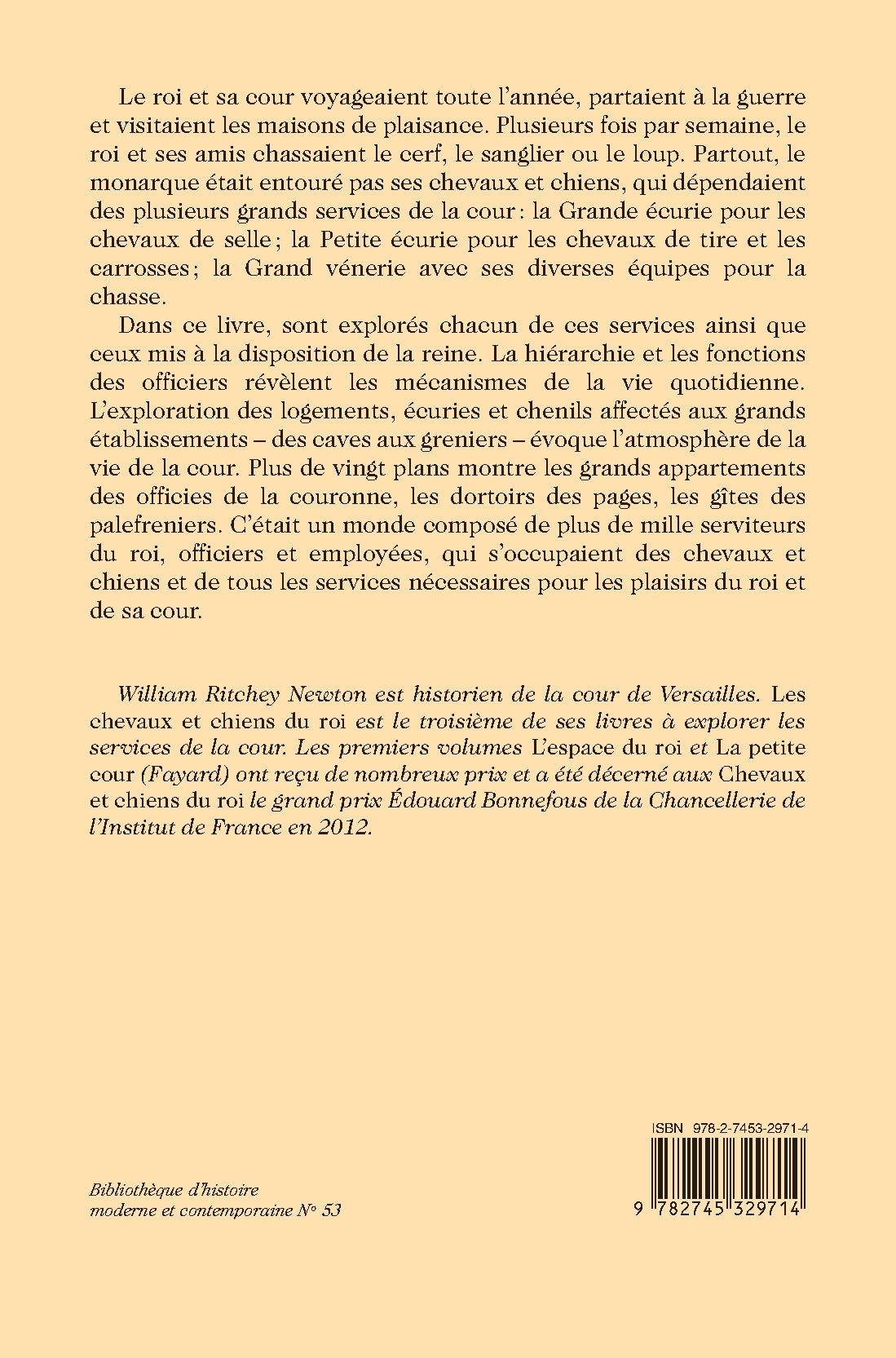 Dans ce livre, sont explorés chacun de ces services ainsi que ceux mis à la disposition de la reine. La hiérarchie et les fonctions des officiers révèlent les mécanismes de la vie quotidienne. L’exploration des logements, écuries et chenils affectés aux grands établissements – des caves aux greniers – évoque l’atmosphère de la vie de la cour. Plus de vingt plans montre les grands appartements des officiers de la couronne, les dortoirs des pages, les gîtes des palefreniers. C’était un monde composé de plus de mille serviteurs du roi, officiers et employés, qui s’occupaient des chevaux et chiens et de tous les services nécessaires pour les plaisirs du roi et de sa cour.