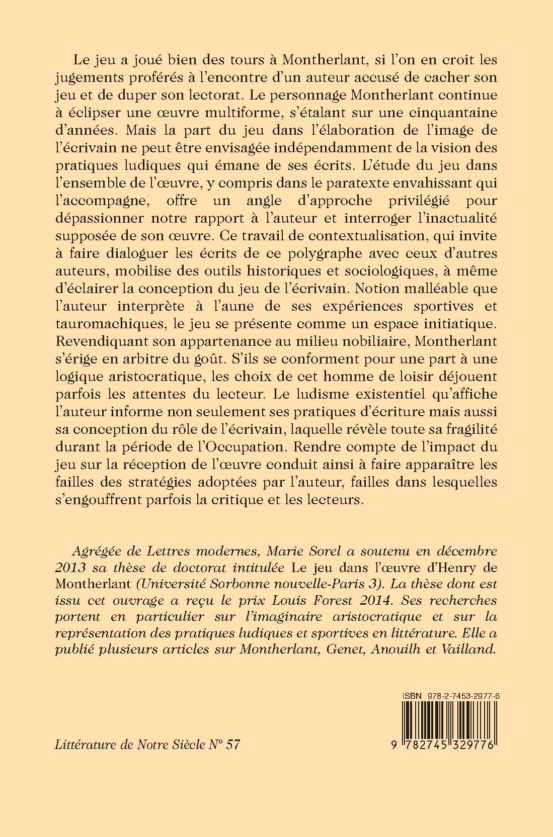 Agrégée de Lettres modernes, Marie Sorel a soutenu en décembre2013 sa thèse de doctorat intitulée Le jeu dans l’œuvre d’Henry de Montherlant (Université Sorbonne nouvelle-Paris 3). La thèse dont est issu cet ouvrage a reçu le prix Louis Forest 2014. Ses recherches portent en particulier sur l’imaginaire aristocratique et sur la représentation des pratiques ludiques et sportives en littérature. Elle a publié plusieurs articles sur Montherlant, Genet, Anouilh et Vailland.