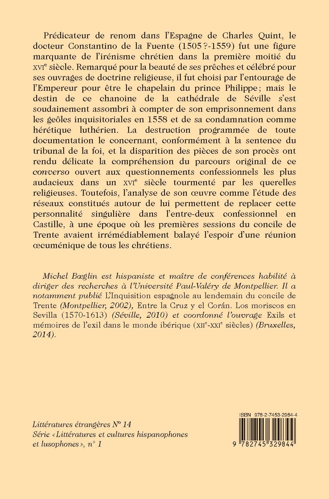 Prédicateur de renom dans l’Espagne de Charles Quint, le docteur Constantino de la Fuente (1505 ?-1559) fut une figure marquante de l’irénisme chrétien dans la première moitié du XVIe siècle. Remarqué pour la beauté de ses prêches et célébré pour ses ouvrages de doctrine religieuse, il fut choisi par l’entourage de l’Empereur pour être le chapelain du prince Philippe ; mais le destin de ce chanoine de la cathédrale de Séville s’est soudainement assombri à compter de son emprisonnement dans les geôles inquisitoriales en 1558 et de sa condamnation comme hérétique luthérien. La destruction programmée de toute documentation le concernant, conformément à la sentence du tribunal de la foi, et la disparition des pièces de son procès ont rendu délicate la compréhension du parcours original de ce converso ouvert aux questionnements confessionnels les plus audacieux dans un XVIe siècle tourmenté par les querelles religieuses. Toutefois, l’analyse de son œuvre comme l’étude des réseaux constitués autour de lui permettent de replacer cette personnalité singulière dans l’entre-deux confessionnel en Castille, à une époque où les premières sessions du concile de Trente avaient irrémédiablement balayé l’espoir d’une réunion œcuménique de tous les chrétiens.