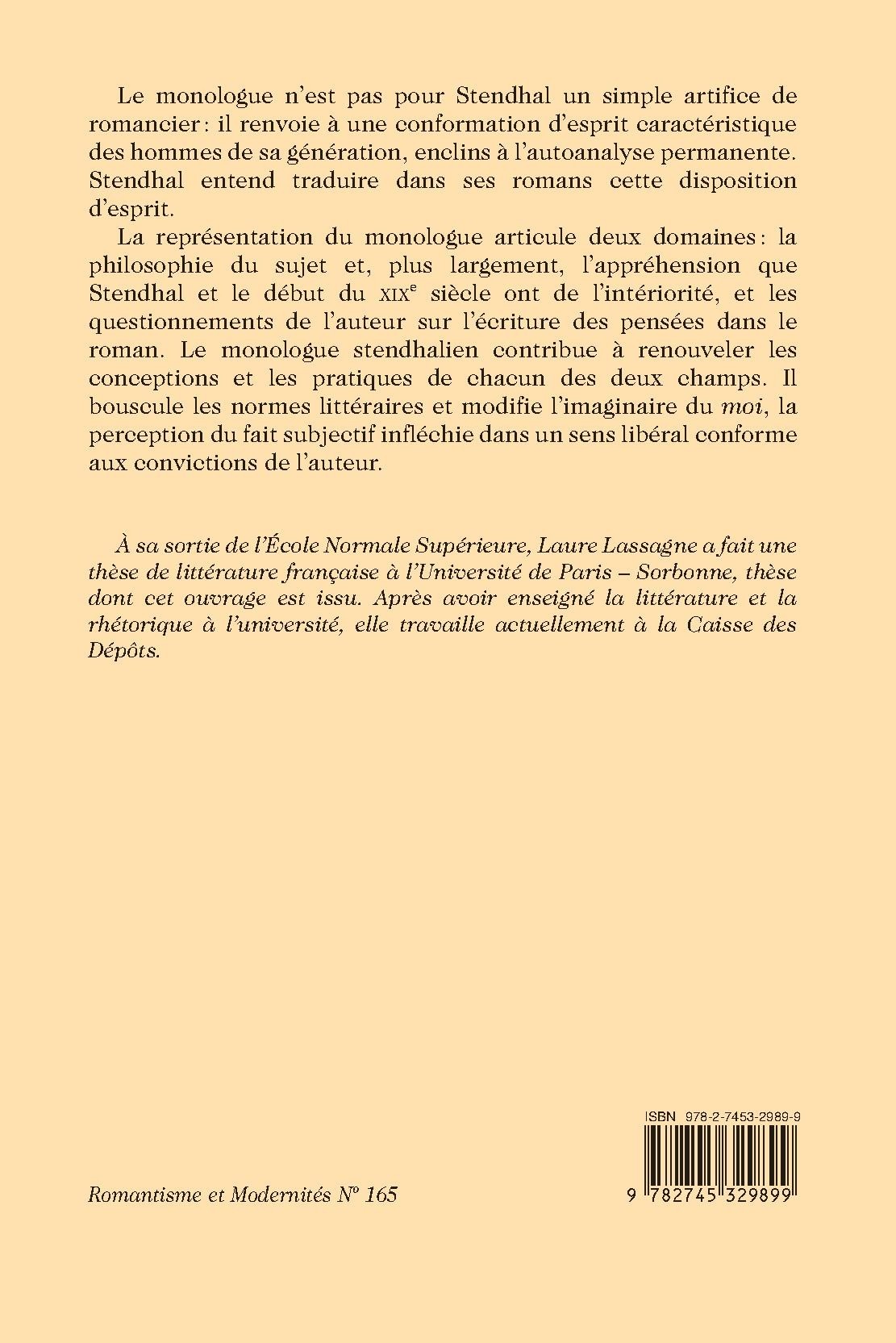 Le monologue n’est pas pour Stendhal un simple artifice de romancier : il renvoie à une conformation d’esprit caractéristique des hommes de sa génération, enclins à l’autoanalyse permanente. Stendhal entend traduire dans ses romans cette disposition d’esprit. La représentation du monologue articule deux domaines : la philosophie du sujet et, plus largement, l’appréhension que Stendhal et le début du XIXe siècle ont de l’intériorité, et les questionnements de l’auteur sur l’écriture des pensées dans le roman. Le monologue stendhalien contribue à renouveler les conceptions et les pratiques de chacun des deux champs. Il bouscule les normes littéraires et modifie l’imaginaire du moi, la perception du fait subjectif infléchie dans un sens libéral conforme aux convictions de l’auteur.