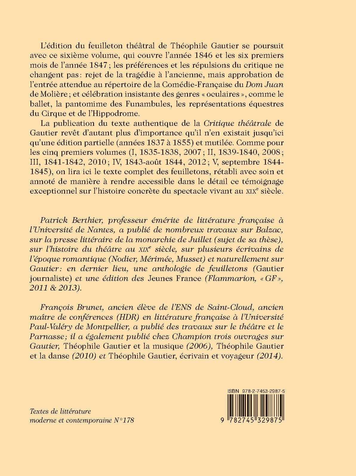 authentique de la Critique théâtrale de Gautier revêt d’autant plus d’importance qu’il n’en existait jusqu’ici qu’une édition partielle (années 1837 à 1855) et mutilée. Comme pour les cinq premiers volumes (I, 1835-1838, 2007 ; II, 1839-1840, 2008 ; III, 1841-1842, 2010 ; IV, 1843-août 1844, 2012 ; V, septembre 1844-1845), on lira ici le texte complet des feuilletons, rétabli