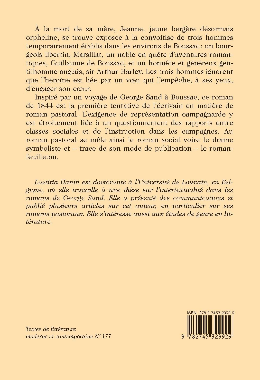 À la mort de sa mère, Jeanne, jeune bergère désormais orpheline, se trouve exposée à la convoitise de trois hommes temporairement établis dans les environs de Boussac : un bourgeois libertin, Marsillat, un noble en quête d’aventures romantiques, Guillaume de Boussac, et un honnête et généreux gentilhomme anglais, sir Arthur Harley. Les trois hommes ignorent que l’héroïne est liée par un vœu qui l’empêche, à ses yeux, d’engager son cœur. Inspiré par un voyage de George Sand à Boussac, ce roman de 1844 est la première tentative de l’écrivain en matière de roman pastoral. L’exigence de représentation campagnarde y est étroitement liée à un questionnement des rapports entre classes sociales et de l’instruction dans les campagnes. Au roman pastoral se mêle ainsi le roman social voire le drame symboliste et – trace de son mode de publication – le roman feuilleton.